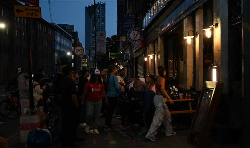 Figure 2 摄于伦敦希思罗快线 到伦敦已经将近当地时间晚上九点,等我们下了地铁开始前往公寓应该已经过了九点。不过好在得益于伦敦的高纬度,我们还可以在地铁上欣赏到伦敦的晚霞,并且当时我们还在感慨,这么好的天气也太不符合“雾都”的刻板印象。 7月14日,恰好是欧洲杯足球联赛的决赛,并且正好是英格兰对战西班牙。我们一行人一出地铁站,就看到当地酒馆门口围坐着一群球迷在欢呼、鼓掌、唱歌。KCL的带队老师Vera也是一名球迷,我们就看到在等红灯的间隙Vera凑上去瞥了一眼,并一同开始尖叫:当时刚好英格兰比西班牙1:1踢平。在渐暗的天空下,街上已经没什么行人,路上的车甚至也寥寥;但是一群人围坐在路边的小酒馆门前,一同观看、并为了他们国家的球队进球而庆祝。我不知道该如何去更仔细地描述那种冲击感,我无比清晰地认识到我已经离开了我所熟悉的地域、我所成长的文化。但是看着那群球迷,又不禁会心一笑:哪怕拥有不同的文化背景,但情感是没有隔阂的。而这或许也是我对伦敦的第一印象。