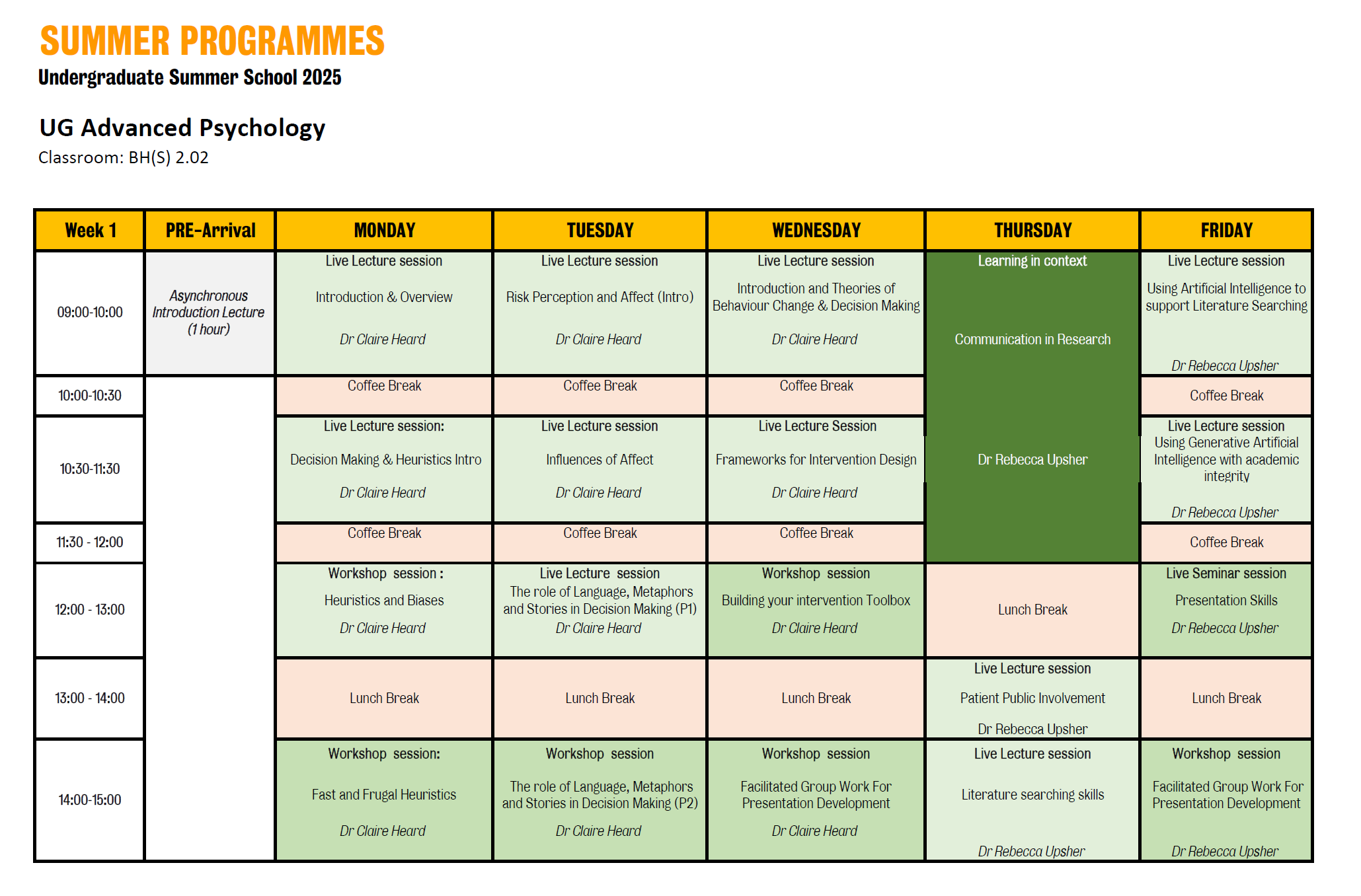 本次项目的课程设置具有清晰的逻辑脉络,前后衔接紧密,形成了一个从理论基础到研究方法,再到跨学科应用的完整学习闭环。 第一阶段的核心内容由Dr. Claire Heard讲授,聚焦于人类决策的心理机制与行为干预。这一阶段的学习为我奠定了坚实的理论根基。首日课程以“决策与启发式”为主题,深刻剖析了人类在复杂环境中的判断模式。在此之前,我对“启发式”的理解较为片面,常将其等同于导致判断偏差的认知缺陷。然而,通过了解Kahneman和Tversky的“启发式与偏差”框架,以及Gigerenzer提出的“快速节俭启发式”理论,我认识到启发式实为一种适应性的认知工具。课堂上分析的案例,如医院利用“快速节俭树”模型更准确地判断胸痛患者风险,以及伦敦治安法庭高达92%的保释决策准确率,都生动地证明了简单决策规则在现实中的高效性。这让我意识到,理性决策并非一味追求信息完备下的最优化,而是在有限条件下寻求满意解的艺术。 第二天的课程进一步深化了对决策复杂性的认识,重点探讨了决策的主观建构性。Dr. Heard通过“陪审员决策的故事模型”阐明,个体在面对碎片化信息时,会主动地编织叙事、填补逻辑空白,从而形成一个自洽的“故事”,其决策很大程度上取决于哪个故事更具连贯性和唯一性。这揭示了决策远非纯理性的计算过程,而是深受个人认知框架影响的建构活动。随后,关于“语言隐喻”和“框架效应”的内容让我印象深刻。例如,将犯罪比喻为“野兽”还是“病毒”,会显著影响公众对惩治或预防政策的支持倾向。这让我深切体会到,信息的表现形式本身即是影响决策的强大变量。此外,“风险感知”部分揭示了专家与公众在风险评估上的差异,而“情感在决策中的作用”则系统梳理了整合情感与偶然情感的不同影响机制,特别是评估倾向框架指出,愤怒会带来高确定感并导致风险低估,而恐惧则引发不确定性并导致风险高估。这些内容极大地丰富了我对决策行为的理解维度。 第三天的课程顺利过渡到行为干预的实践层面。我们系统学习了行为改变阶段模型(跨理论模型)、COM-B模型等理论框架,并深入探讨了“助推”与“去偏”两类核心干预策略。我了解到,Type 1助推(如改变选项排列、设置默认选项)是通过利用认知特性来引导行为,而Type 2策略(如用自然频率呈现信息)则是通过简化信息环境来辅助决策。这些理论与方法,为我们小组后续设计研究方案提供了直接且重要的理论支持。 项目中期,课程重点转向研究方法的实战训练,由Dr. Rebecca Upsher等老师负责。第四天的课程涵盖了学术展示技巧、文献检索与患者和公众参与三个模块。在学术展示环节,我们通过分析TED演讲、艺术作品等不同传播形式,认识到有效沟通不仅在于内容的准确性,更在于能否与受众建立共鸣。下午的文献检索技能培训非常实用,老师详细讲解了关键词选择、布尔逻辑运算符的使用以及专业数据库的检索技巧,并进行了现场演示,这对我完成小组研究的文献综述部分帮助巨大。此外,“患者与公众参与”理念的引入,让我认识到让研究受益者参与到研究的各个阶段,是确保研究具有现实意义和伦理价值的重要环节。