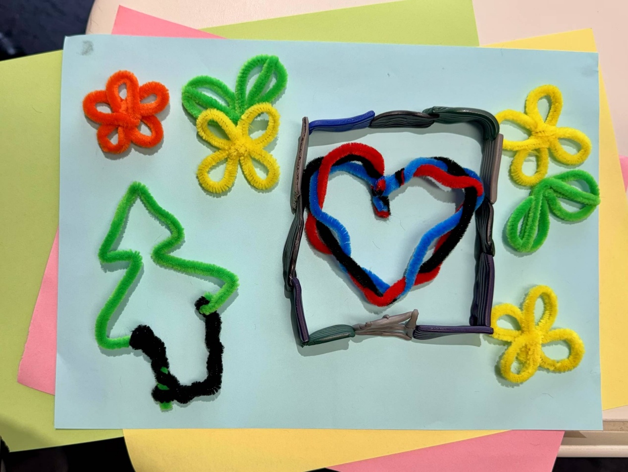 从美术馆回来后我们还以小组为单位亲自参与了创作。我们以扭扭棒为主、粘土为辅,创作出了抑郁症患者的精神困境。我们用红黑扭扭棒交织,拧出心脏的形状,表达抑郁对人造成的阴霾;又用粘土捏出城墙,把心围在中间,表达患者“习得性无助”的境况;最后用各色扭扭棒扭出花草放置在墙外,表达外界对她们的关切。虽然过程磕磕绊绊,结果也显得抽象难以理解,但这从无到有、从零到一的一步给了我们全新的体验与感触。