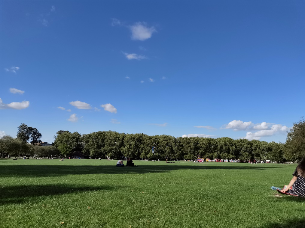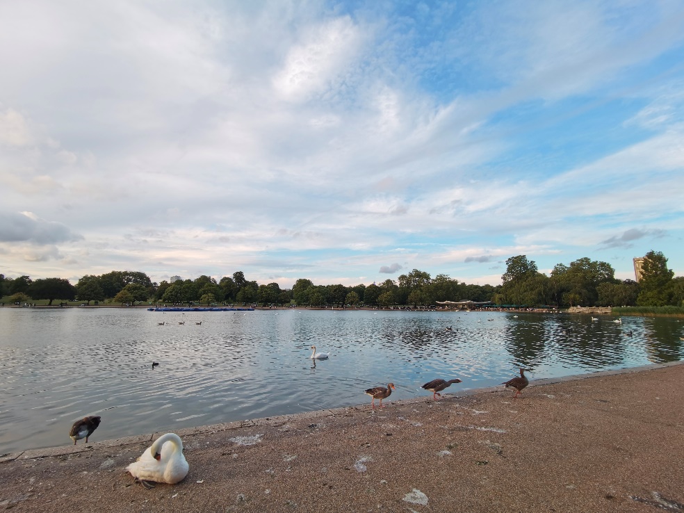 学校宿舍窗户外就能看到冲入云霄的the Shard,夜里还能清晰看到朵朵云雾在它腰身处飘过,窗外是油画般的建筑和小区运动场,常有人在这里踢足球、打乒乓球(英国人的乒乓球打的真的不是很好),人少时还有小松鼠偶来驻足。然而这远远不是伦敦的全貌。在课程结束后的时间里,我们去沿着泰晤士河city walk,一路路过London Bridge、莎士比亚剧院、London Eye、Big Ben,走过威斯敏斯特桥,继续向前走到议会大厦、威斯敏斯特教堂,去吃藏在钢筋水泥深处的意大利披萨,吃完后坐在议会大厦前的草地上吹着晚风,看着已经亮灯的Big Ben和London Eye,看着远处的小男孩在草地上跑来跑去。 后来我们还去了海德公园。吃完街边不起眼的俄罗斯餐厅,穿过小路走入海德公园。巨大的、可以在上面随意打滚的草地。这里的草地不像别处,带了一点沉闷,这里的草地是有起伏的,让我觉得我躺在上面能从坡上滚下来再借着动能滚上另一个小坡。不过我最终没有这样做。再往前走是大大的湖。里面很多白天鹅、埃及雁、骨顶鸡,以及很多我不知道名字的雁和鹅。尽管立有“禁止投喂”的标示牌,还是有很多人向鸟儿们投喂饼干、面包等,鸟儿们还是会兴冲冲地来赴宴(鸟儿们看不懂标示牌,所以这不怪它们!)。埃及雁长得很斑驳,嘴里叼着老大爷拿给它的一整片面包片,走起路来颇为滑稽。后来我们坐到了湖边的草地上,准备吃找了好多天才买到的苹果派。然而吃了没多久就被蜜蜂盯上了,为了躲避蜜蜂的追击,我们在晚上的冷风中疯跑,跑着跑着又觉得自己狼狈得好笑,最后干脆把苹果派送给了蜜蜂朋友。