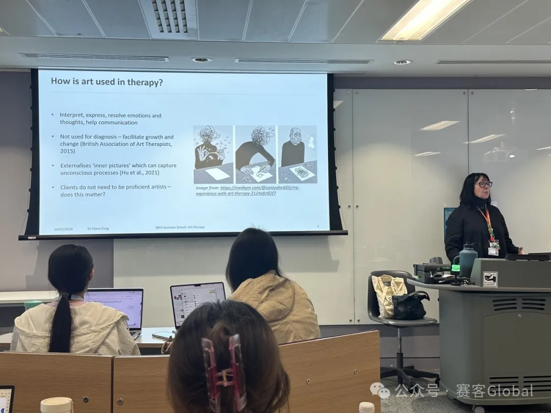 图5 Dr Fiona Essig授课情景 在接下来的课程中我们还讨论了电影和文学如何描绘心理健康以及这是否会加强刻板印象。此外,Dr Fiona Essig老师带领我们思考以积极方式使用艺术的三种方式 —— 增加服务提供者的同理心,允许服务使用者表达他们的真实体验以及直接解决刻板思考方式。同学们了解到心理健康在电影和文学中的表现方式、艺术在培训心理健康专业人员中的作用以及如何使用艺术来促进对心理健康的理解。 在课程的最后一天与我们相伴两周的三位老师作为课堂展示的评委回到课堂。在经历了充分的准备后,同学们分组进行课堂展示,之后接受老师的提问。