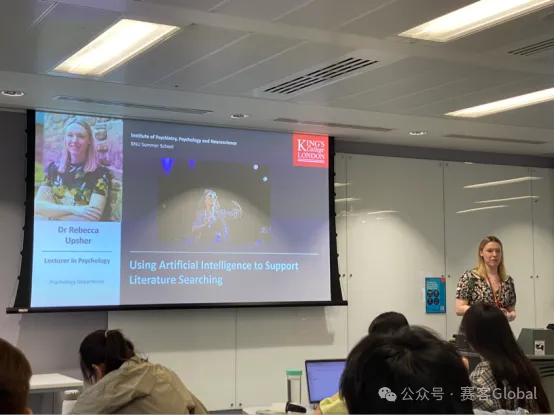 图3 Heard教授授课情景 第二模块的课程由Dr Rebecca Upsher负责。7月18日的课程中,老师详细讲授了有效讲演的要点和技巧,来帮助我们更好地完成汇报工作。通过具体的讲解和实例分析,让同学们理解了一场好的讲演需要具备哪些特点,如清晰的结构、引人入胜的内容、恰当的视觉辅助工具和自信的演讲风格等等。此外,老师还组织了同学们进行小组讨论,通过互动交流,大家共同探讨了如何提升讲演的质量,思考了不同讲演方式的优缺点。 在7月19日的课程中,老师详细介绍并演示了四种学术用途的AI工具:Scite、Elicit、Litmaps和Hubmeta。通过具体的示范和操作指导,老师帮助同学们了解如何利用这些新兴技术来提高学术工作效率。随后,老师组织了讨论互动,让同学们思考AI技术带来的便利和可能存在的局限性。在讨论中,同学们认识到AI工具的诸多优点,如提高工作效率、帮助学习新知识、提供研究指导和技术支持等。然而,大家也意识到AI可能带来的潜在问题和局限,如AI生成内容可能存在错误、使用不当可能导致学术不端行为、过度依赖AI可能使人们失去独立思考能力等。