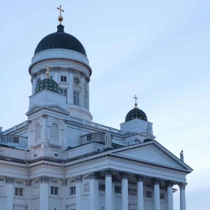二、文化体验:慢下来,走一走 在课外,我们也积极探索芬兰的城市文化。赫尔辛基和图尔库各种各样的美术馆、博物馆和教堂给我留下了很深的印象,芬兰国家美术馆藏有各地的油画、雕塑等作品,一些经典展品前甚至排起参观长队——见到莫奈真迹的那一刻,不懂艺术的我也非常激动;红教堂和白教堂建造精美肃穆,图尔库大教堂则是纯正的中世纪风格,城堡也静静矗立在河畔。