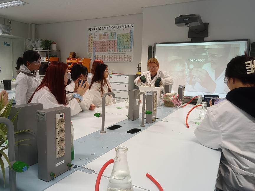 图 4 趣味实验 在众多讲座中,第二天下午牛老师的讲座给我感触最深。牛老师既体验过中国的教育,如今又在芬兰的教育行业工作,因此她能够准确指出双方的主要区别,明白我们的困惑和需求。其中牛老师结合自己女儿在芬兰从小到大的学习经历,讲述了当地学校会传授人际沟通技巧,引导学生们到社会中去进行真实的创业实践等,具体生动地介绍了什么是“21世纪必需技能”。之后有关特殊教育的讲座中,牛老师也补充了由于父母均为非母语者,学校对她的女儿进行的芬兰语课后辅导,对我们的学习和理解都有很大帮助。 讲座过后我们前往附近的师范学校,现场参观了芬兰学生的实际学习环境。在七年级的英语课上,孩子们非常自然放松地学习、讨论、和老师互动与交谈,甚至大方对老师说“这是你的问题”。虽然内容是阅读课文并学习单词,但是课堂气氛非常融洽,并没有感到枯燥。在讲解老师的介绍下,我们了解到芬兰对教师的培养相当重视:每位教师都可以探索自己的教学方式,在课堂的设计上有极高的自由度;学校也为不同阶段的学生准备了针对性的教室技能培养课程。走在学校内,我们也可以看到自由讨论的学生、墙上的画作和手工作品等,整个校园都蕴含着丰富的创造力。