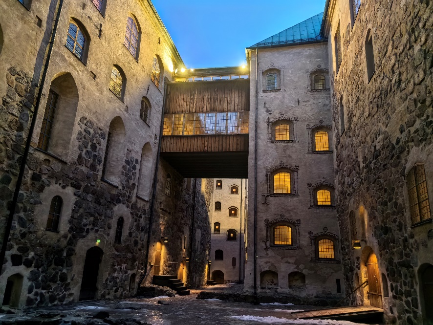 离开赫尔辛基,图尔库的学习时间极为短暂,因此也只能挑拣着景点进行游玩。在图尔库的第二天,我们参观了图尔库城堡(图 6),一座极为典型的欧洲中世纪建筑风格城堡,算不上壮观,但是其建筑的完整保存让我们有机会得以窥见欧洲中世纪贵族的生活。城堡中狭窄的通道,身着中世纪服装的NPC,一个个房间,与蓝调时刻的天空辉映,我们仿佛置身于彼时而游离于现代。其中,城堡内更类似一个博物馆,保存的器物中,除去欧洲中世纪贵族们的生活用品,娱乐用品之外,竟还看到了中国古代,郑和下西洋时期到北欧的明代瓷器,对于中国古代的繁荣昌盛,与放眼全世界毋庸置疑的影响力,我的认知又得到了刷新。图尔库同样也是一个海港城市,沿着布满冰雪的河边行走时,有吹来的海风,有沿岸停泊的帆船,也有落日余晖洒在身上,此刻,时间的沙漏放缓了步伐,在异乡的人仿佛也融入了此刻的静谧。