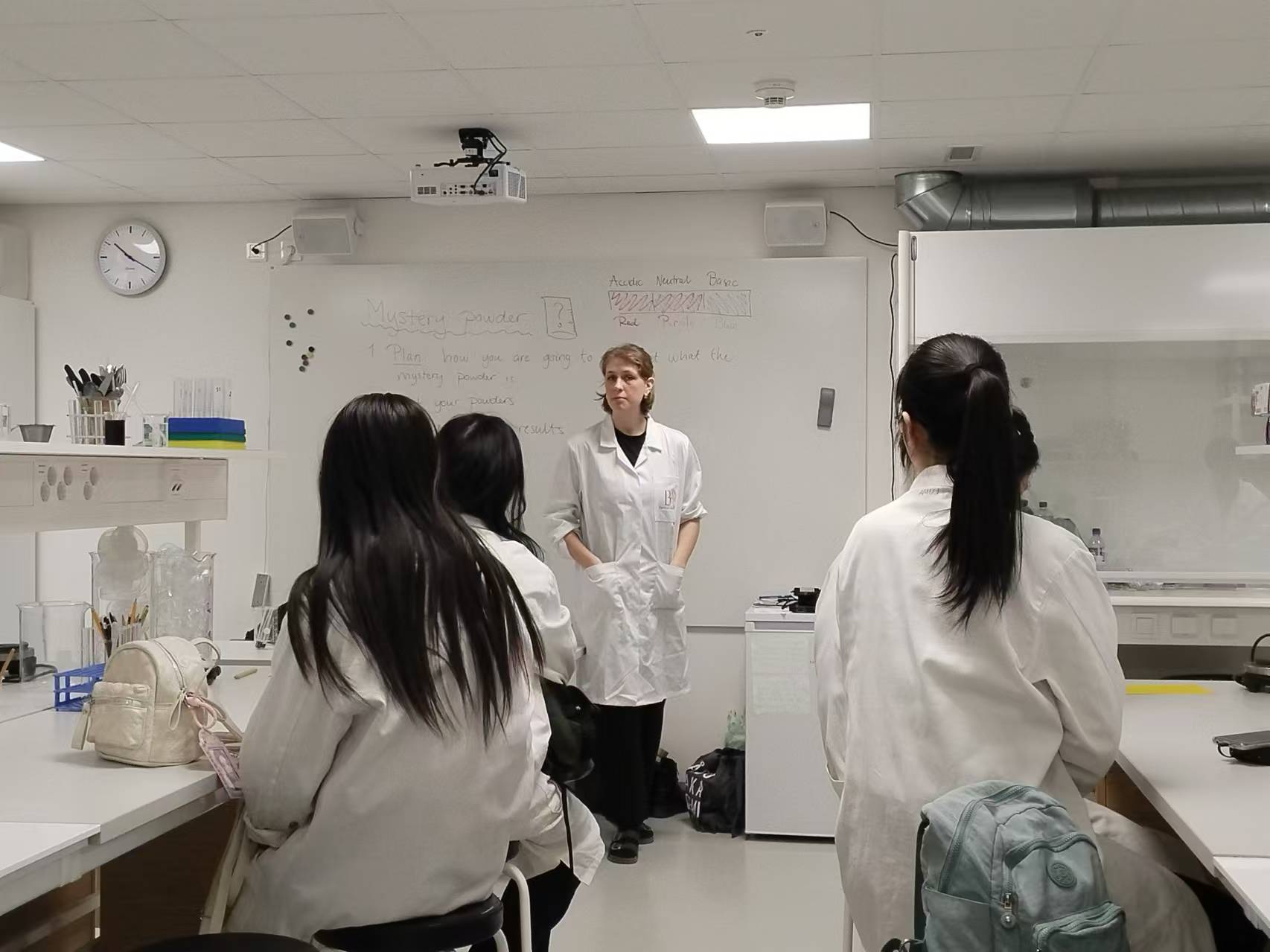 图 3 在九年一贯制学校观摩 科技实践:从实验室到教育现场 在赫尔辛基科学中心Heureka,400余项互动展项将物理、化学等学科原理转化为趣味实验,学生通过搭建风力发电模型、操作分子结构装置等亲自动手实践,直观理解科学知识。科技博物馆则通过诺基亚通信设备、极地科考装备等展品,呈现芬兰科技创新脉络。 前往图尔库大学后,团队深度参与科学教育实践: (1)现象导向学习实验:在Laszlo Major与Matleena Tuomisto两位老师指导下,学生通过“鉴别神秘粉末”实验(观察物理特征、酸碱反应等),掌握现象教学法设计逻辑;