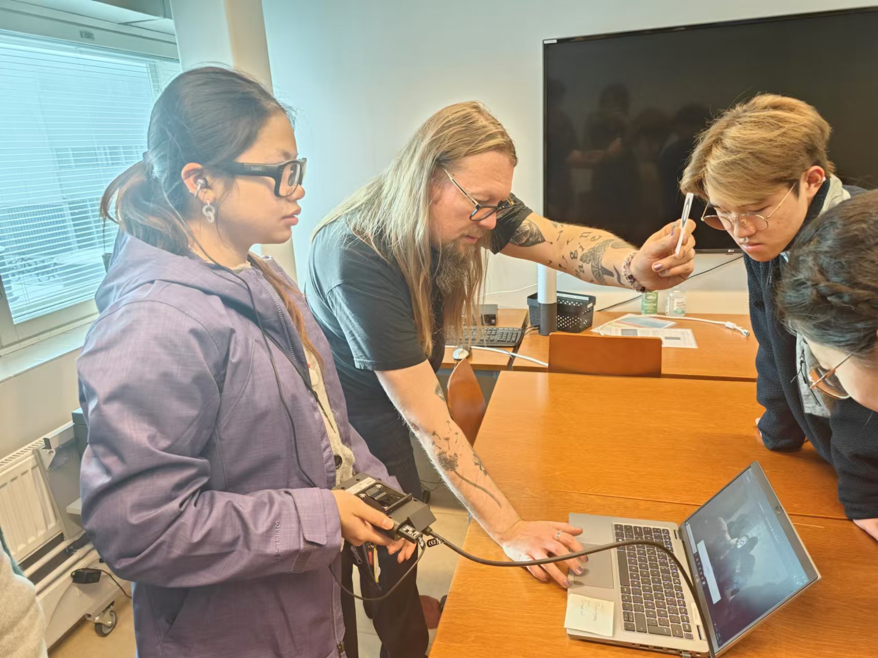 学科交叉:心理学与前沿技术 图尔库大学心理学系Tuomo Häikiö老师展示眼动追踪技术在阅读障碍研究中的应用,并让学生亲身体验便携式眼动仪操作。Laszlo Major老师对比人工神经网络与人类大脑认知机制,引发对人工智能与心理学融合的思考。