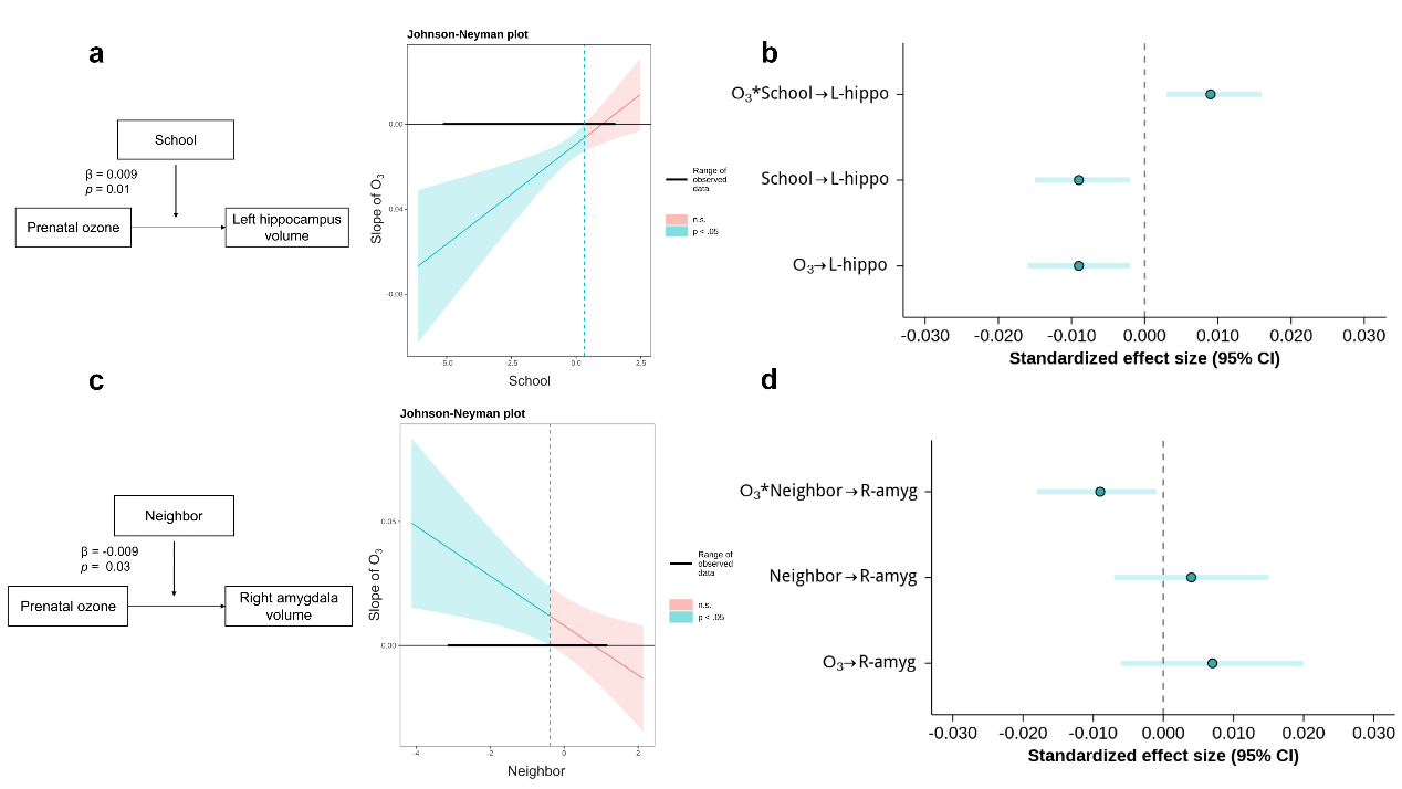 图1. 孕期臭氧暴露与学校/社区环境对边缘系统发育的交互作用 研究进一步发现,学校环境在"孕期臭氧暴露→左侧海马体发育→认知/精神病样体验"中介路径中发挥显著调节作用(见图2):在不利的学校环境下,孕期臭氧暴露通过降低青少年左侧海马体发育增幅,进一步降低认知功能和增加精神病样体验;而在良好的学校环境中,中介效应不显著,这凸显出支持性的学校环境具有一定的保护作用。 社区安全虽然显著调节孕期臭氧暴露与右侧杏仁核发育之间的关系,但对青少年认知功能及精神病样体验的间接效应均不显著(见图2)。当前效应未达显著性可能与随访时间较短有关,未来的研究应进一步探讨臭氧污染与社区环境跨生命周期的长期影响及其潜在神经机制。