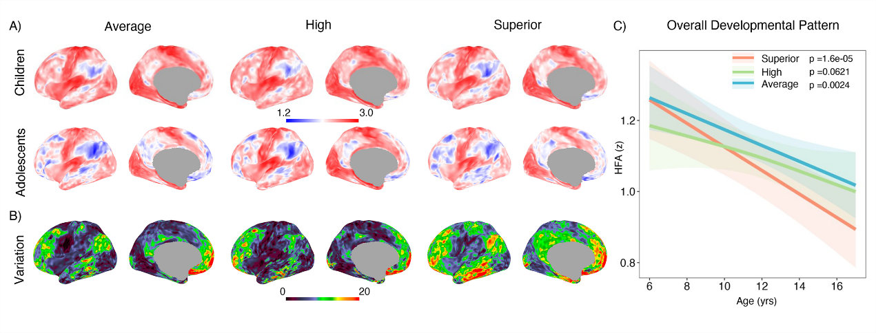 图1 同伦功能亲和度图谱计算及儿童青少年的同伦功能亲和度比较。A) 同伦功能亲和度图谱的计算示意图;B) 儿童组与青少年组的同伦功能亲和度图谱;C) 两组的同伦功能亲和度在不同大尺度皮层功能网络上的分布;D) 两组同伦功能亲和度差异统计效应量最大脑区。 同时,皮层同伦功能亲和度与智力之间呈现出与发展阶段依赖的关系:进入青春期后,与总智商间的负相关更为突出,主要见于前额叶、岛叶及内侧默认网络等区域(图2)。进一步按总智商将个体分为平均智商、高智商与超高智商三组后,研究发现超高智商个体在全脑范围内呈现更快且更广泛的皮层同伦功能下降趋势,并在多个网络上表现出更强的发育变异性(图3),这从功能上指向了半球专业化发育进程的加速与更高的神经功能效率。
