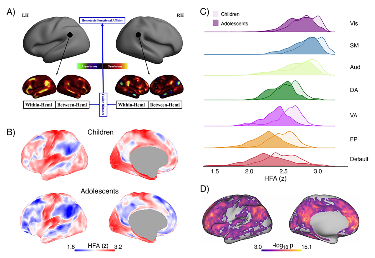 发展认知神经科学领域国际期刊《Developmental Cognitive Neuroscience》近日刊出陈丽珍博士和左西年教授的研究论文“Intellectual ability and cortical homotopy development in children and adolescents”,系统展示学龄阶段儿童至青少年(6-18岁)大脑皮层两个半球功能同伦的发育规律及其与智力发展的动态关联。研究基于其前期所提出“同伦功能亲和度”这一原创功能同伦图谱方法[1],利用“彩巢计划-成长在中国”加速纵向队列研究数据[2],沿袭皮层形态发育及其智力关联的组分发育交叉设计[3],为理解认知能力发展个体差异提供了神经机制新视角。 功能同伦是指大脑左右半球镜像区域在功能活动上的相似程度,是维系两半球高效通信与功能整合的关键机制。这一神经特性支撑从基础感知到高级认知的广泛脑功能,被认为是智力等复杂综合认知能力发展的基础。已有研究表明[4,5]:个体发育过程中,大脑由早期的广泛连接逐步走向更为专业化的网络组织,功能同伦水平随之下降,反映出双侧大脑功能向精细化与高效化的演进。然而,关于功能同伦的学龄期发展与智力之间关系仍然缺乏纵向队列研究证据。 为此,本研究基于“彩巢计划-成长在中国” 178名6–16.9岁儿童青少年志愿者的345份加速纵向追踪数据,利用同伦功能亲和度图谱方法系统分析了功能同伦的随龄变化,并建模了不同智力水平个体的发育轨迹。结果显示:从儿童到青少年时期,皮层功能同伦总体呈下降趋势,尤其在默认网络、额顶网络与腹侧注意网络等高级联合皮层区域最为显著(图1)。随着年龄增长,个体同伦功能亲和度图谱与成人的同伦功能图谱、皮层髓鞘化以及功能主梯度的空间分布相似性逐步增强,提示人类大脑功能同伦成熟与其结构功能组织的协同演进和成熟。