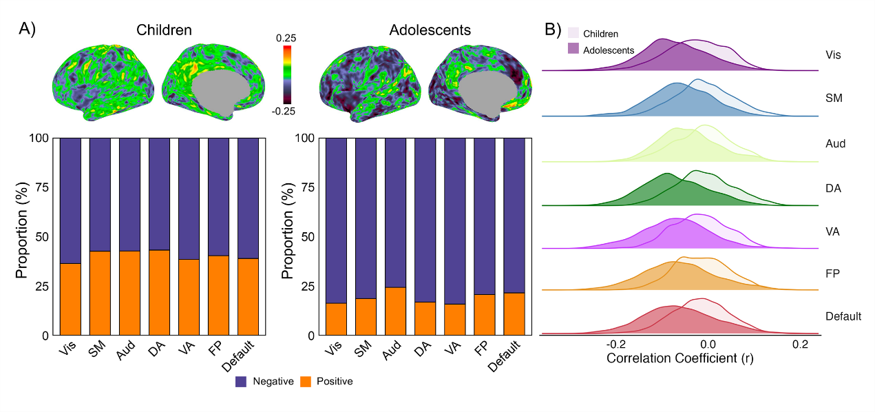 图2 儿童与青少年的皮层同伦功能亲和度与总智商的关联。A) 不同年龄组同伦功能亲和度与总智商的相关及每个网络内相关系数的正负比例;B) 两组相关系数在不同网络上的分布。