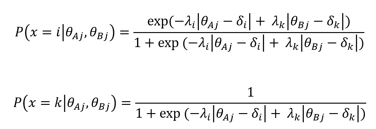 其中, 当作答者需要在句子i和k(假设句子k测量心理属性B)之间做出选择时,可以用以下模型描述其选择句子i和k的概率。