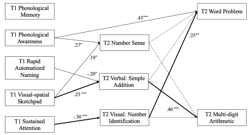 近期,污污漫画 杨秀杰副教授课题组发表了名为“Phonological processing and spatial attention contribute to mathematics performance in different ways: A 3-year longitudinal study”的研究。该研究发表在中科院大类一区教育学TOP和PSYCHOLOGY, DEVELOPMENTAL方向TOP期刊Early Childhood Research Quarterly上(5-year IF=5.1)。 数学技能的一些子成分,例如算术计算与复杂单词问题的学习对于后期的职业发展与学业成功至关重要。而一些一般领域的认知技能,例如空间注意与语音加工被认为与儿童的数学表现相关。但两种技能影响数学技能发展的机制尚不清楚,因此本纵向研究旨在考察中国儿童语音加工技能和空间注意能力对于数学表现的贡献。 研究共有184名儿童参加了4年的追踪测试,其中男生106名(平均年龄8.87 ± 0.37岁)。对于这些儿童首先使用联合瑞文测验测试非言语智力,之后分别测试了语音加工的三个子成分:语音意识,语音记忆与快速命名,使用视觉空间画板测量视觉空间注意,使用持续性表现任务测量持续性注意。此外还进行了非符号比较任务,简单加法任务,数字识别任务,复杂单词任务与多位数计算。整个测试流程分为两个阶段,分别是幼儿园与小学三年级,不同阶段的任务测试顺序随机打乱。 结果发现,在语音加工成分中,只有第一阶段的语音意识对第二阶段的复杂单词任务有贡献。此外,第二阶段的数字加工成分完全中介了第一阶段的空间注意了与第二阶段的数学表现。具体来说,第二阶段的简单加法中介了第一阶段的视觉空间注意与第二阶段的算术运算;第二阶段的数字识别中介了第一阶段的持续性注意与第二阶段的复杂单词任务。