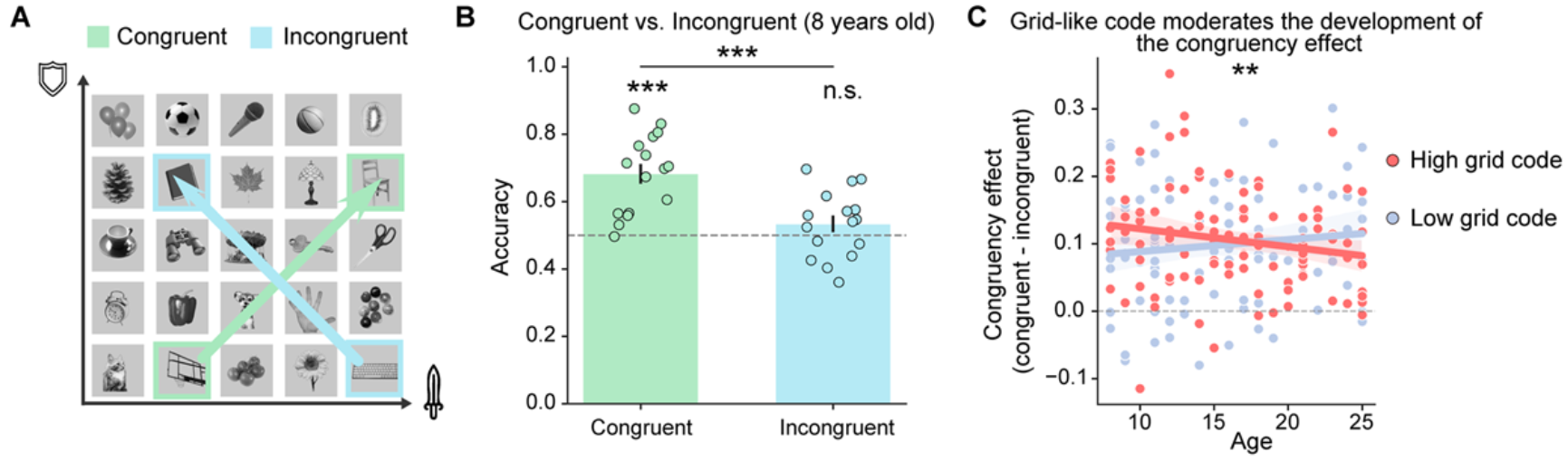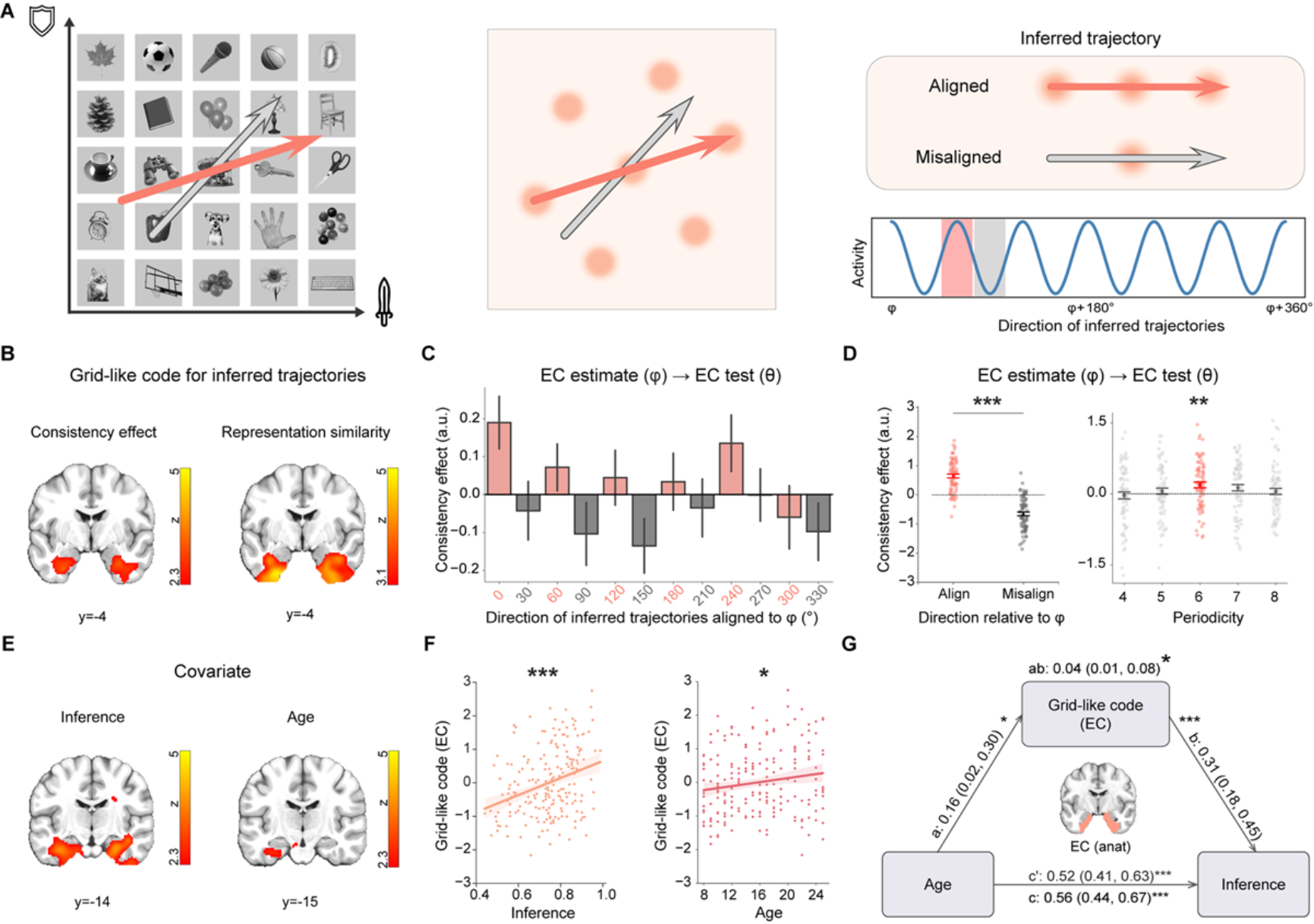 图2:内嗅皮层类网格编码如何随年龄增长而增强,并支撑二维知识地图中的推理能力提升