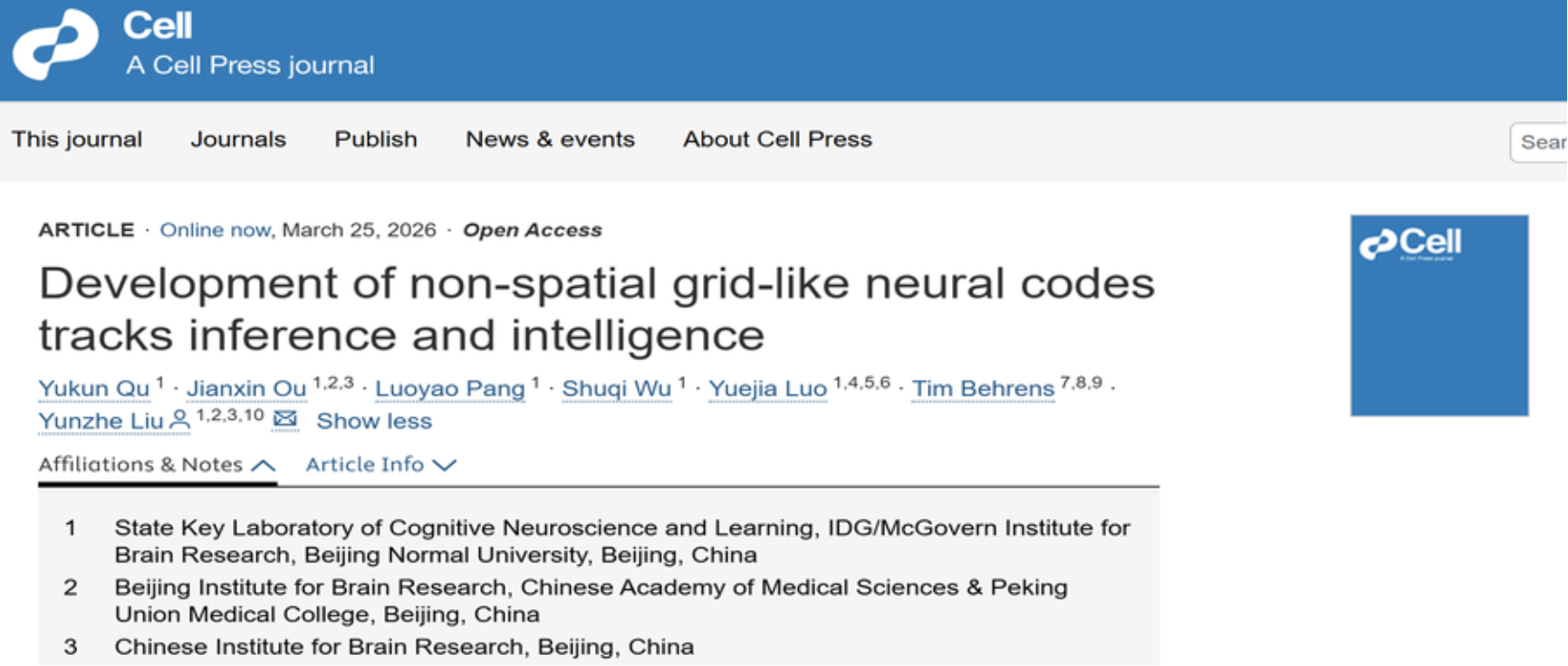 图7:支撑认知地图的神经机制随发育成熟,并与智力水平相关 综上,本研究表明,EC类网格编码的发育成熟与推理能力及知识同化能力的提升密切相关;mPFC的发展则进一步支持对象间关系距离的编码,促进新旧知识的复杂整合。这一认知地图神经表征的发育轨迹与一般智力水平紧密相关,为理解“认知地图表征的成熟如何驱动抽象知识结构的发展并支撑灵活推理”提供了跨层次的机制解释。目前,实验室正持续推进两条交叉研究线路:一是结合AI技术,对儿童高级认知能力的发展轨迹开展纵向追踪,推动脑科学与AI赋能教育;二是以人类探索、归因与规划等高级认知能力的发展规律为基础,为具备真正主动探索与泛化能力的AI智能体研究提供认知计算基础。 污污漫画 博士生瞿宇堃为该论文第一作者,教授柳昀哲为通讯作者。污污漫画 教授罗跃嘉的团队也作出了重要贡献。该研究得到国家科技创新2030—“脑科学与类脑研究”重大项目、国家自然科学基金、北京市自然科学基金、国家社会科学基金重大项目、深港脑科学创新研究院及中央高校基本科研业务费的资助。 原文链接://www.cell.com/cell/fulltext/S0092-8674(26)00266-7