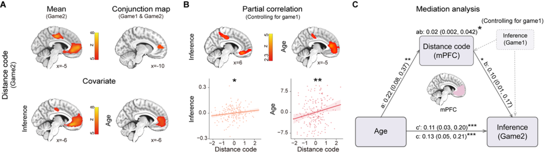 图5:内侧前额叶皮层对对象间远近关系的编码随年龄增长而增强,并选择性支撑非局部推理