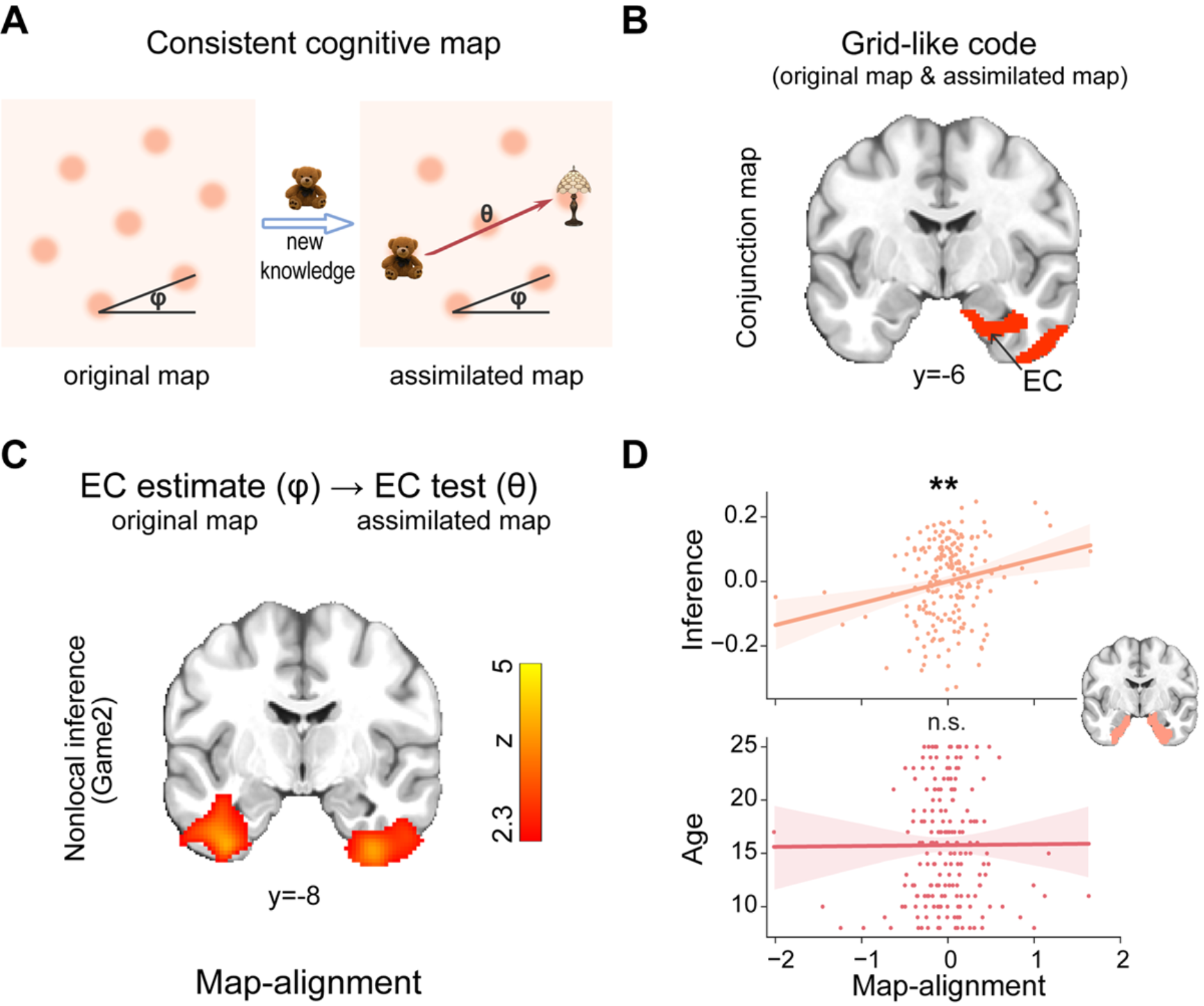 认知能力的发育并非仅表现为知识量的增加,更体现为信息组织方式从零散走向结构化的转变。发展心理学家皮亚杰提出,儿童会随着发育逐步建立起能够支持推理与知识同化的结构化“图式”。然而,图式所对应的神经机制至今仍不清楚。内嗅皮层(EC)中的网格细胞通过六边形周期性放电实现空间定位,而这一编码机制也可推广至非空间的抽象概念域。本研究由此探究:网格系统是否同样支撑抽象知识图式的发育,并驱动推理能力从儿童期向成年期跃迁? 为探究上述问题,本研究设计了一套“知识地图”任务。在学习阶段,参与者逐步学习25个虚构角色在“攻击力”和“防御力”两个维度上的相邻关系,但始终不知道这些角色实际上构成了一张5×5的二维结构图。在随后的fMRI扫描阶段,参与者需要回答数百道此前从未直接见过的推理题,每道题都要求同时整合两个维度的信息。任务完成后,研究者又引入新角色,测试参与者将其快速整合进已有知识框架的能力。行为结果显示,年龄与推理正确率显著正相关,且这一关系不受记忆差异影响;新知识同化能力也随年龄显著提升(图1)。