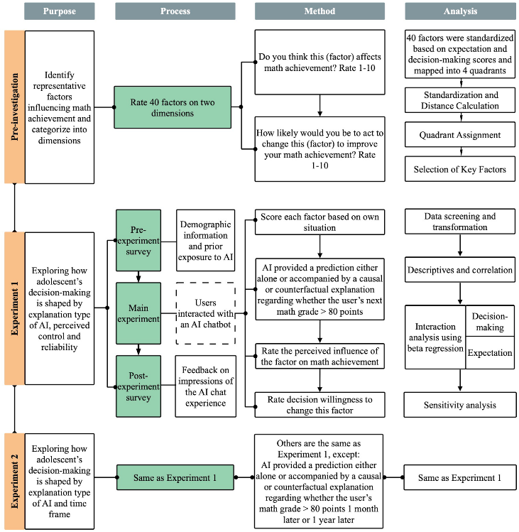当下人工智能被广泛应用,青少年与AI的互动越来越成为其学习的重要组成部分。青少年在认知、情绪以及决策行为上均具有特殊性,他们对AI既充满好奇也更容易产生信任,不仅会向AI寻求开放问题的解释,还会根据AI的建议采取相应的行动。同时青少年决策具有依赖直觉、偏好即时反馈、对控制感高度敏感等特点,这些特点使其在与AI互动时,既可能更开放地接受建议,也可能产生心理抗拒或消极反应。针对此情况本团队意识到AI能否有效惠及青少年使用者不仅取决于模型算法和数据质量,也取决于AI解释能否契合青少年的心理特性。 针对上述问题,陈英和课题组进行了相关研究并于2026年1月在教育学顶刊Computers & Education(SSCI前1%,中科院一区TOP,5年影响因子13)线上发表了题为How explanatory features of AI and time frame reshape adolescents’ decision-making的研究论文。该研究系统揭示了AI解释特点、用户心理特性以及时间框架如何共同塑造青少年在学习情境下的决策意愿与预期。 本研究将AI提供的解释划分为三种类型。预测型:仅做出预测但不提供详细解释;因果解释:用因果结构解释系统给出某项预测的原因;反事实解释:采用“要是改变什么,就会发生什么”的语言结构向用户提供可参照的行动路径。这三种解释在提供信息透明度、激发控制感与触发情绪反应上存在本质差异。为深入探究AI解释特点对青少年在数学学习情景中决策产生的不同影响,该研究开发了一项在线AI交互平台,在保证真实人机对话生态效度的同时,系统操纵了AI的三种解释类型及其他关键变量,并实时采集用户的聊天数据。一共近四百名在读中学生参与了此项研究。实验1考察了解释类型、感知控制感与感知可靠性的三方交互作用;实验2则聚焦于解释类型与时间框架(短期vs.长期)如何共同影响被试的相关决策。研究流程见图1。