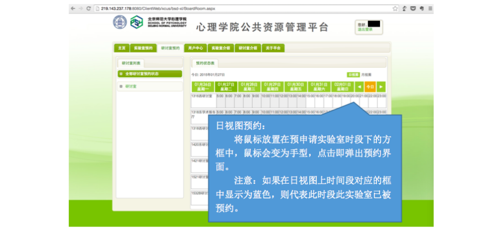 一、IE登录“心理学院公共资源管理平台”,激活账号: A. 网址://219.143.237.178:8080/ClientWeb/xcus/bsd-xl/Default.aspx B. 登录的用户名(1)为“学号/工作证号”,密码(2)为“一卡通查询密码”。(一台机器只能同时登陆一个账号) C. 使用前请认真阅读《预约规则》、《实验室文明使用守则》(3) D. 可以通过“研讨室介绍”了解各研讨室的配置条件,找到满足需要的研讨室。 E. 新用户首次登陆时,需要激活。请在激活界面填写自己的手机号和邮箱(5)。 F. 进入主页,开始准备研讨室预约。“研讨室预约”和“用户中心”最为常用。
