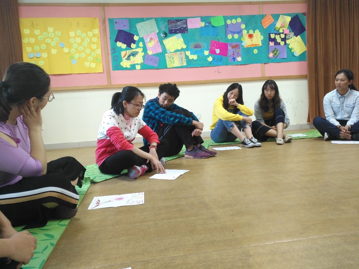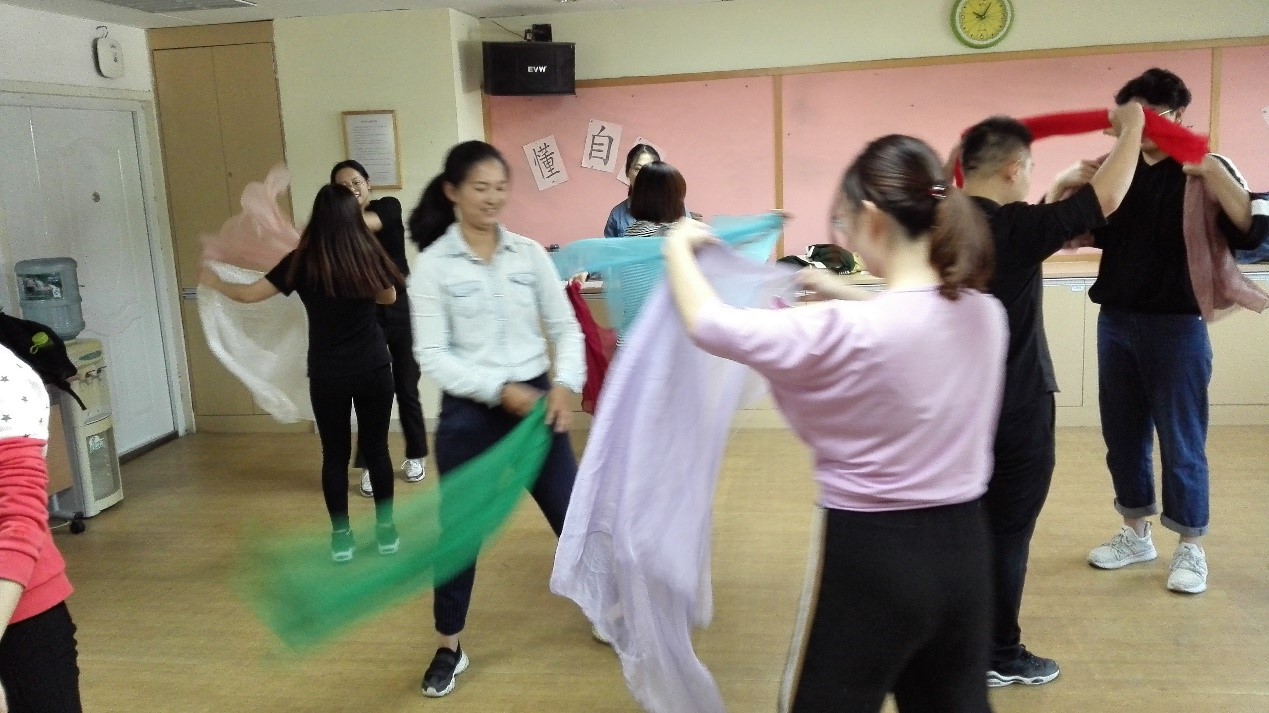 在绘画之后,每人拿一条丝巾配合舞动,通过舞动的方式来表达你的生涯议题。分三个部分:收集、释放、整理。徐老师分别精心挑选了三段较为贴切的音乐;同学们两两组合一名带领者、一名跟随者,由带领者做各种各样的动作,跟随者相当于一面“镜子”同步同时做着带领者的动作。