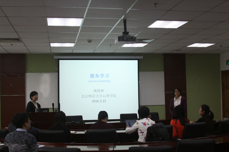 2016年3月22日下午3时,姚梅林老师向心理学院学工处老师开展了有关“服务学习”的培训。心理学院分党委副书记王瑞敏、分团委书记史佳鑫等人参与培训。
