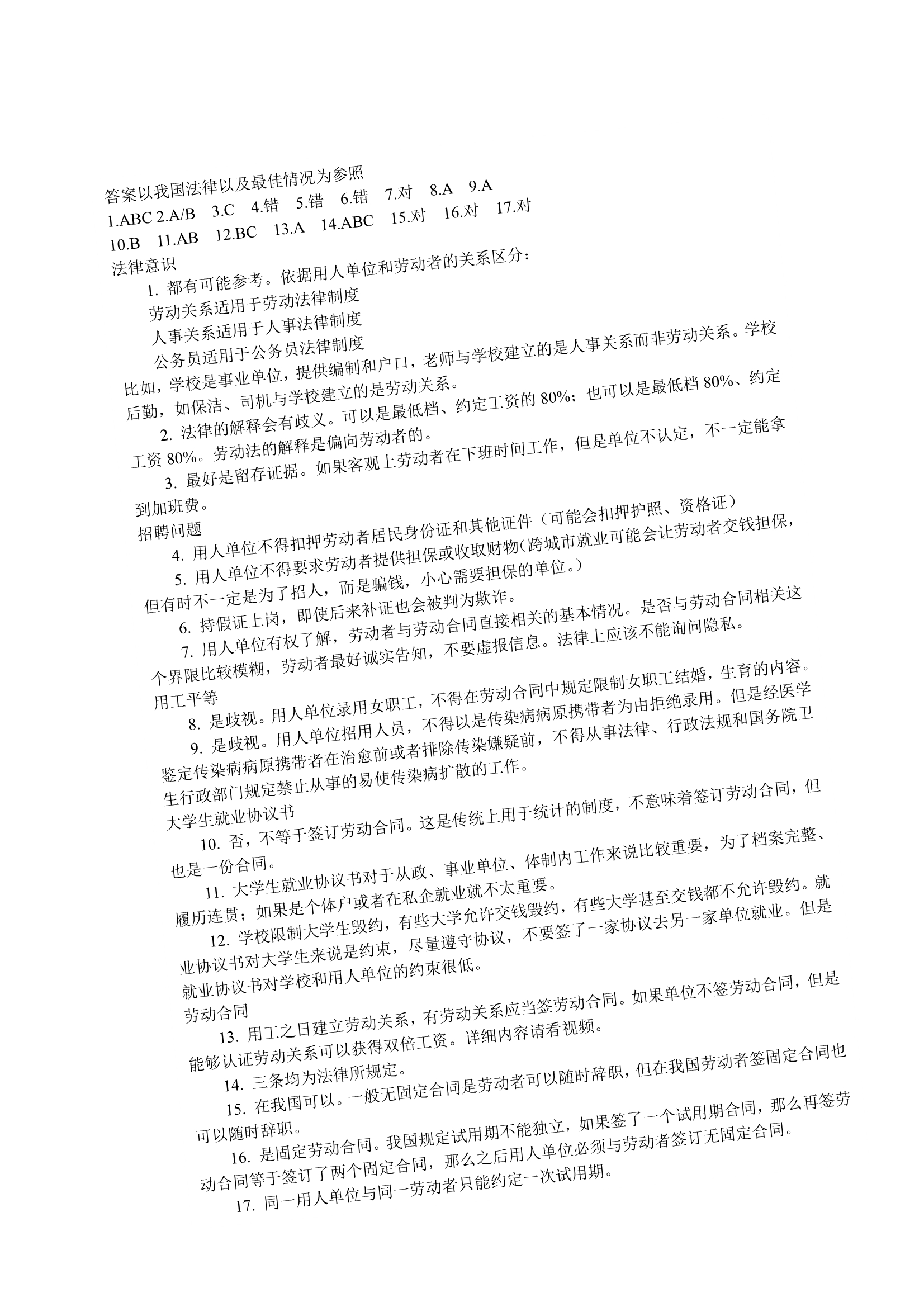 法律意识 【不定项选择题】 1. 如果与学校发生纠纷,应该参考哪些法律? A.劳动法相关 B. 人事法相关 C. 公务员法相关