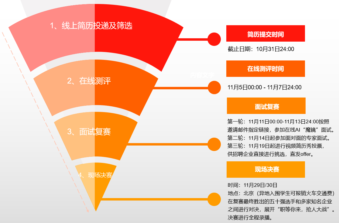 (三)资格赛 1.线上简历投递及筛选 2019年9月30日由猎聘发布简历模板,由参赛者根据要求在线提交文字简历信息。简历提交分两个时间段: 第一批简历提交时间:9月30日00:00-10月15日24:00截止。 第二批简历提交时间:10月16日00:00-10月31日24:00截止。 提交的简历采用猎聘AI系统初筛,北京师范师大学人事测评专家团队人工精筛相结合的方式进行。筛选比例根据每个岗位报名申请的人数情况确定。 2.笔试 简历筛选通过者,根据通知的时间参加在线测评。笔试由原创的客观题组成,采用“猎聘才测”专业化考试平台“5G校招通用胜任力测评” 工具进行,测查通用能力及个性特点。笔试题共125道客观题,限时50分钟。测评报告可根据需要向被测者提供反馈。 线上测评时间:11月5日00:00-11月7日24:00。