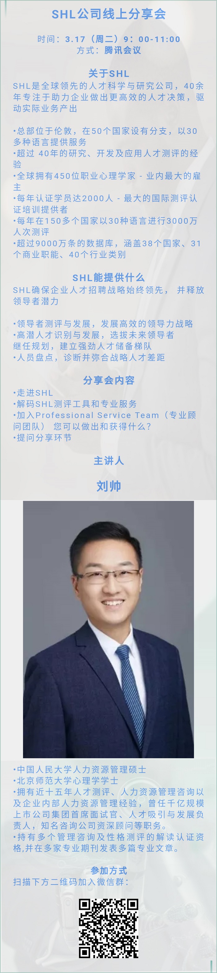会议时间:2020/3/17 9:00-11:00 点击链接直接加入会议://meeting.tencent.com/s/5WBt7IWa0e535 会议ID:634 812 923 大咖1、乔老师:污污漫画 党委书记致辞; 大咖2、彭老师:SHL中国区首席顾问致辞; 大咖3、刘老师:SHL中国区顾问总监——“SHL中国区业务发展介绍”; 大咖4、安小芬:SHL优秀分析师——“SHL分析师那点事儿” 你还不心动?欢迎大家扫描海报的二维码进入活动群,并提前15分钟进入“腾讯会议”来参加我们的分享会哦! |
