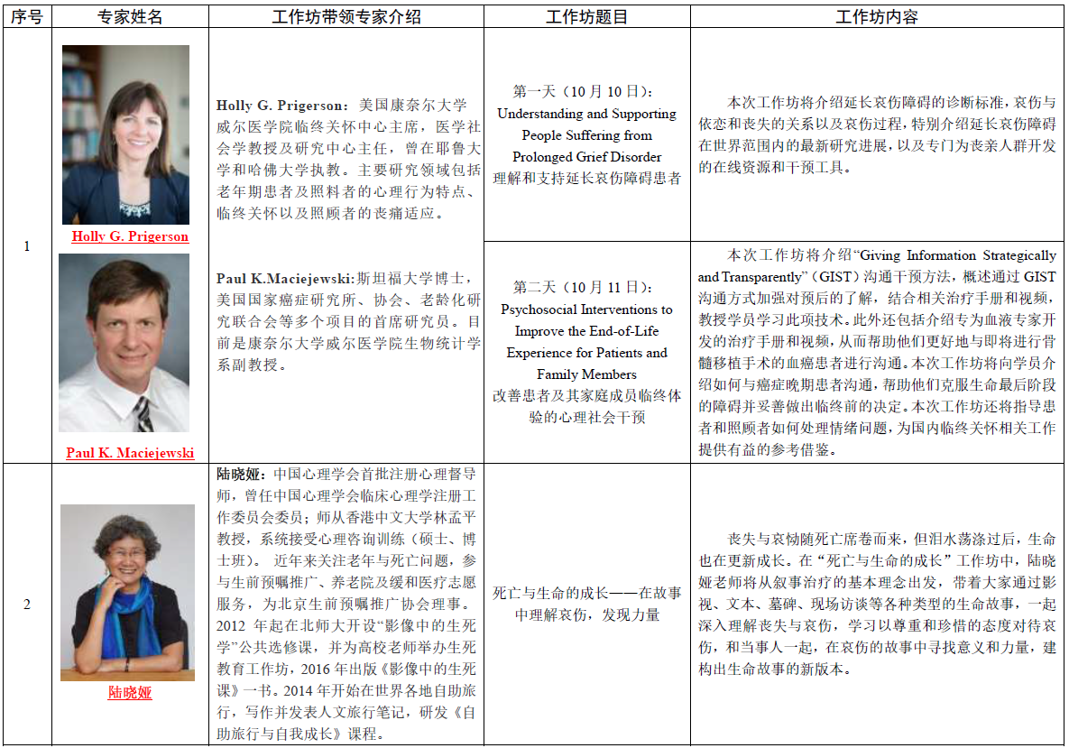 2019年10月12-13日,首届中国哀伤研究与干预国际研讨会将于污污漫画 召开。为促进我国哀伤研究和干预的普及与深化,大会组委会荣幸邀请国内外哀伤研究与干预的知名专家Holly G. Prigerson教授、Paul K. Maciejewski博士、陆晓娅博士、Amy Chow教授、Bonnie J. Gorscak博士等,于首届中国哀伤研究与干预国际研讨会会前与会后,分别开展相关工作坊。 工作坊以扎实的理论基础、亲和的授课方式、大量案例分析及实操练习,对核心主题进行深度解析,帮助学员切实受益。 工作坊培训对象:哀伤及创伤领域的研究人员与学者;高校心理学、社会工作、医学等专业的师生;高校辅导员;危机处理相关人员;精神卫生医护人员;综合医院、肿瘤专科、临终关怀医护人员;社工、社会机构及公益组织人员;卫健委、计生协及民政系统的干部及工作人员;对哀伤感兴趣的组织和个人等。