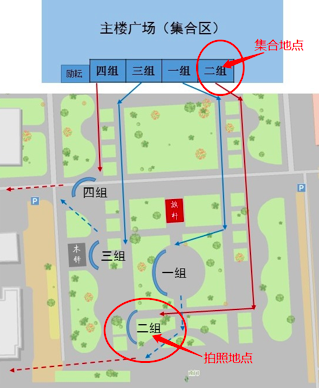 分组为第二组,下面是集合地点和拍照地点的示意图,请务必于7:30前在集合地点处找学部标志集合完毕: