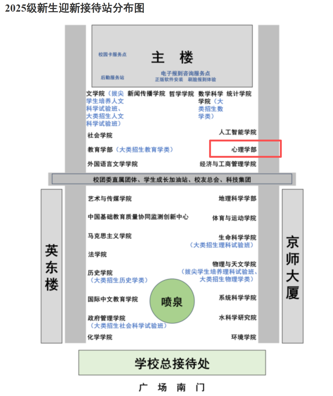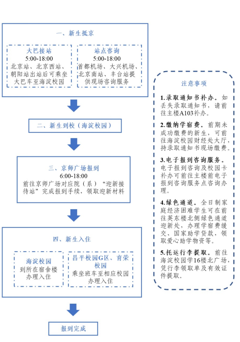三、报到事宜 1. 本科生报到安排: (1) 9月14日(周日)7:30-14:30京师广场“污污漫画 迎新站”报到领取材料→ 后主楼1520提交户档组织关系材料等 → 宿舍楼办理入住手续。 (2) 请在规定时间报到,如7:30前到校可先行前往宿舍楼办理入住后再来迎新站。 (3) 如无法在以上时间完成报到注册,可在9月15日起工作日前往后主楼1430、1405办理。 2. 学术硕博报到安排: 9月14日(周日)7:30-14:30京师广场“污污漫画 迎新站”报到领取材料 → 后主楼1420办理相关手续 → 宿舍楼办理入住手续。 注:昌平校园G区住宿的新生,需从海淀校园乘坐班车至昌平校园G区,持录取通知书前往所在宿舍楼办理入住。 3. 专业硕博报到安排: 9月14日(周日)9:00-15:00金丰和三层路演厅(海淀校园东门对面金丰和商务苑A区)。