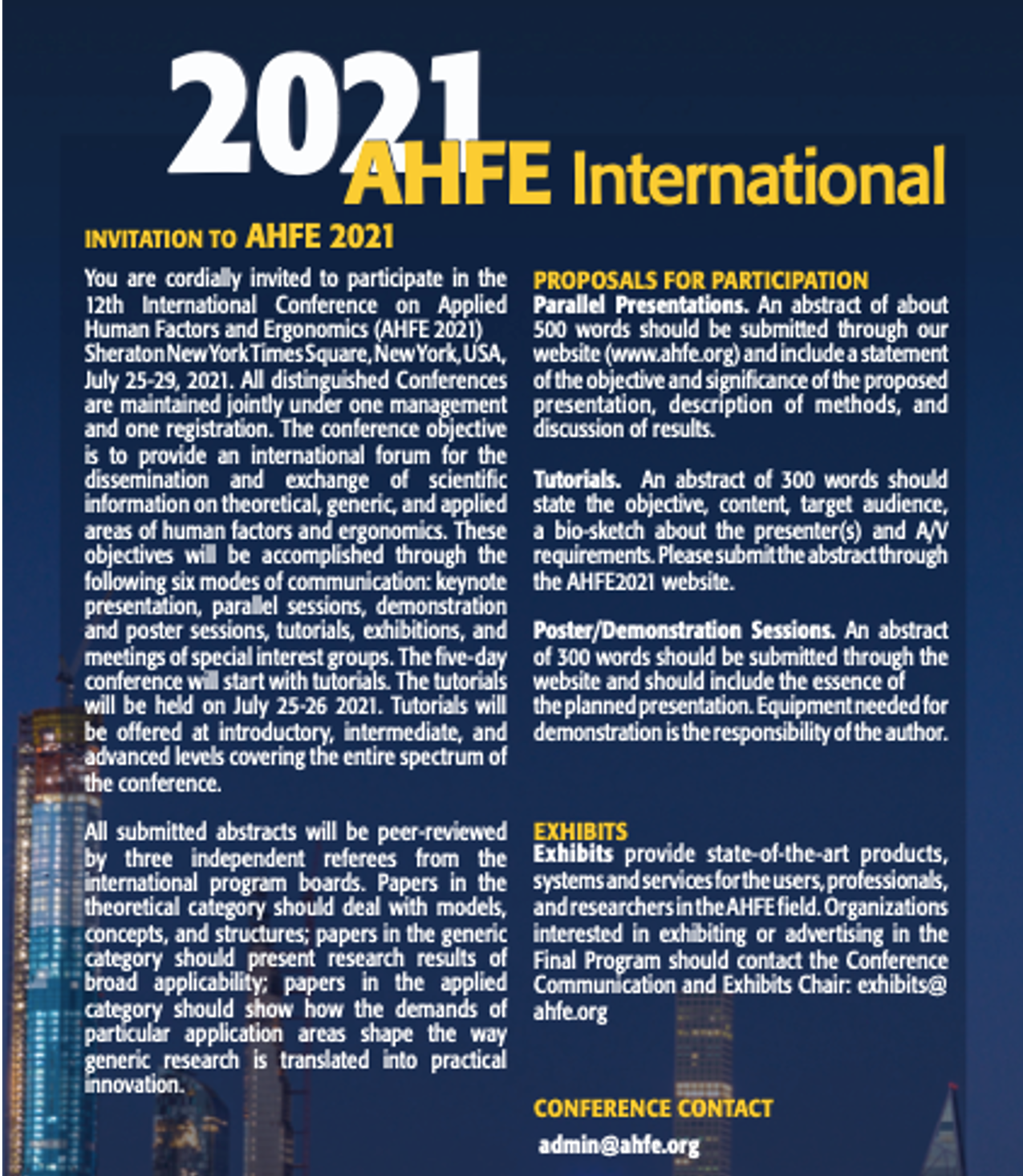 Invitation to AHFE 2021 AHFE 2021 International, jointly with the affiliated conferences, will be held under the auspices of 41 scientific advisory boards comprising 806 board members, under one management and one registration. The international conference will take place at the Sheraton Times Square, New York, United States of America. Wei Liu, as a board member of AHFE 2021, invites you to submit an abstract for paper presentation or poster demonstration of two tracks! Conference Track 1: Usability and User Experience Conference Track 2: Creativity, Innovation and Entrepreneurship You should submit directly to the system by the December 25, 2020, deadline. When submitting online, you should choose “invited,” and include Invited by: Wei Liu. This will help us get each presentation into the proper session. Call for Participation: //2021.ahfe.org/