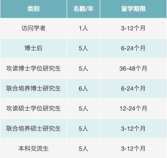 二、选派类别 本项目每年可选派教师(含博士后)和学生(硕博士攻读学位、硕博士联合培养、本科交流生)赴英国伦敦国王学院、曼彻斯特大学和卡迪夫大学访学或留学的名额有32人次。(详情见下图) 本项目暂不受理以下人员的申请:1.已获得国外全额奖学金资助。2.已获得国家公派留学资格且在有效期内。3.已申报其他国家公派出国留学项目尚未公布录取结果。