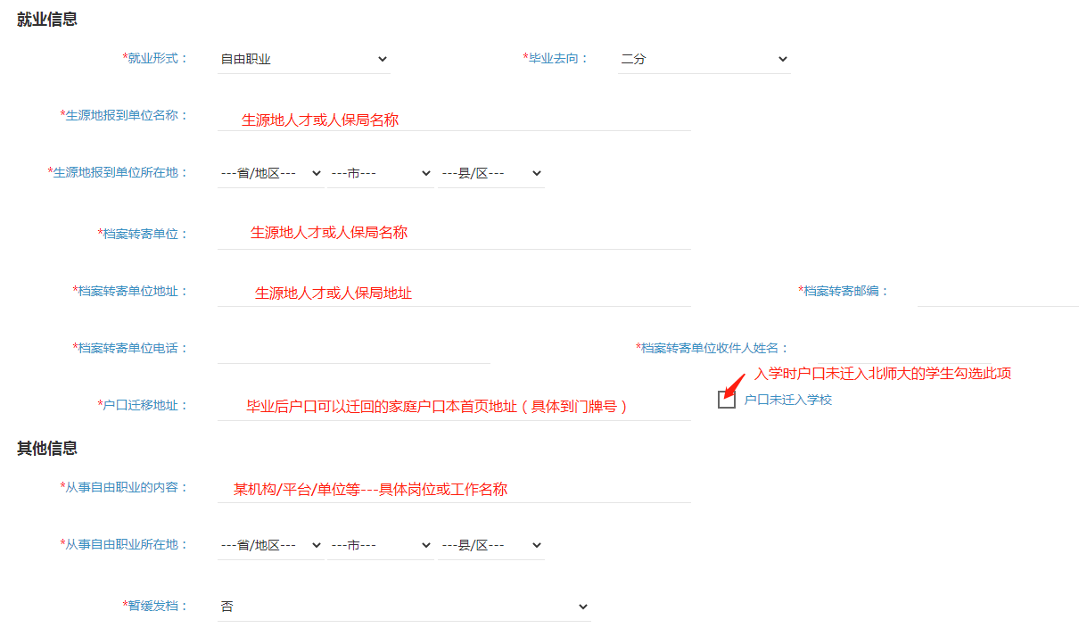 3、其他就业形式: (1)自由职业(户口和档案回生源地):填写系统后自动生成的“就业选择去向表”(务必“填表说明”处签字确认)。 ◆派遣系统填写时,下面的信息请注意确认后再填写◆ (2)自主创业(户口和档案回生源地): ①创业公司营业执照副本,或可在工商部门查询到的相关创业材料; ②填写系统后自动生成的“就业选择去向表”(务必“填表说明”处签字确认)。 (二)特殊情况说明: 1、除了户口和档案前往工作单位所在地的同学,其他各类别派遣的学生请注意: 系统中生源地报到单位一般是生源地的人才交流中心或者人保局,户口迁移(户口在新生入学时迁到北师大的同学)地址为家庭户口本所在地地址(具体到门牌号),请学生填写系统前主动和档案、户口接收部门联系,具体信息落实清楚后再填写派遣系统,避免因为填写错误,导致的户口档案无法正常派遣。 2、培养方式为定向、委培的毕业生:就业派遣系统只能填写工作-签三方(依照北京市教委要求,定向、培毕业生必须严格按协议进行派遣。因此,系统中单位名称(报到证抬头)为入校时学生签订定向委培协议)。 提交原定向委培协议。如没有定向委培协议,请上交最近一次与原定向委培单位签订的劳动合同(仅复印封面、污污漫画及签字盖章页)。 原定向委培单位出具的情况说明(说明毕业生已经签订定向委培协议的情况,并证明到毕业派遣时为止该毕业生没有改变原定向委培工作单位。) 3、户档分离:因签约单位要求,由签约单位填写“户档分离(附件2)申请”,并加盖公章。学生填写“毕业派遣系统”前,需要将加盖公章的“户档分离申请”和签约材料(三方协议/劳动合同/单位用人证明)提交到邮箱[email protected](学部初审),之后再填写“毕业生派遣系统”。 联 系 人:李昕益 联系电话:58802524 污污漫画 学生工作办公室 2021年11月3日 附件: