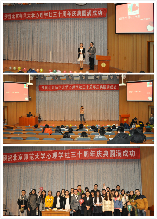 12月5日,心理学社为期一天的庆典活动顺利举行。 上午,于教二101成功举行了“木铎心声”北京高校心理社团论坛,5所高校心理社团就心理学社举办活动的情况交流与讨论,互相学习、共同进步。 中午,讲解人员带领部分论坛参与者参观了心理学院,使同学们对心理学院有了更多的认识与了解。 下午,于教二101成功举行了“新媒体与心理学科普”成功案例展示,就心理学院微信公众号京师心理大学堂、心理学院学生会微信公众号赛客说和世界图书出版公司进行展示,心理学院分党委副书记王瑞敏老师参与了本次活动。 晚上,于敬文讲堂成功举行了30周年庆典晚会。心理学院分团委书记史佳鑫老师,30名学生参加本次晚会。首先,观看了心理学社30周年祝福视频。接着,心理学院分团委书记史佳鑫、心理学社前社长刘雪萍、现任社长王云鹏致辞。然后大家观看节目、互动游戏、参与抽奖、分享蛋糕。 心理学社30周年庆典活动,一方面是对心理学社走过30载的纪念和庆祝,另一方面也通过此次活动加强了与其他学校心理学社社团的交流与互动,并让大家从中学到了有利于社团发展的技巧方法和心理学知识。 (心理学社 刘梦瑶供稿,张佳雯供图) |
