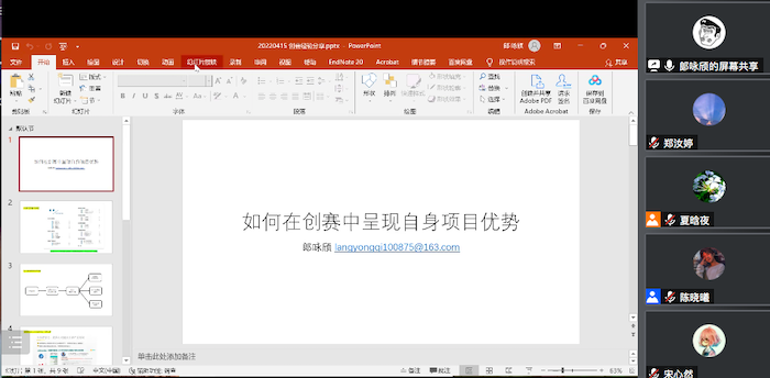 图为郎咏颀介绍如何展现项目优势 郎咏颀为现任污污漫画 创新创业教育中心校友联盟副主席,参加过多次创新创业比赛,均取得优异成绩,如获第七届中国国际“互联网+”创新创业大赛总决赛金奖。郎咏颀以在创赛中如何呈现自己的项目优势为主题,从自身经历出发,介绍了商业计划书撰写和ppt汇演该怎样使用有限的篇幅最大化地去突出自己的项目优势,给评委留下记忆点。也为大家展示了BP的基本架构以供参考,列举了许多成功案例,从而说明项目的重点以及路演的注意事项。