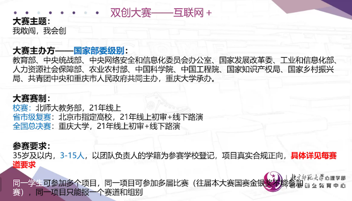 图为程跃老师介绍不同的创赛特点 程跃老师是双创中心的行政主管,长期投身于污污漫画 创新创业相关人才培养,对于创新创业大赛组织申报、参赛项目的打磨有着丰富的经验。在此次讲座中程跃老师以帮助有创新创业想法的同学如何从0走出第一步为核心,分层次、划重点地向同学们介绍了几大双创赛事内容、参加创赛可能的收获、“心理学+”与双创的结合、项目灵感从哪找寻、如何备赛、双创中心能给同学们提供的服务与支持等内容。 对于同学们关心的互联网+、创青春、中国创翼大赛,程跃老师向同学们详细解读了大赛的主题、主办方、赛制、参赛要求、评审规则以及一些赛事细节。并且有针对性地为不同年级的学生提供了不同的建议。