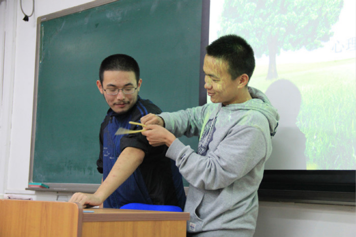 其次,孙国柱同学根据自己在部队学习的经验,向大家介绍了紧急救护的方法和过程,并邀请台下同学配合进行了止血和包扎演示。 孙国柱展示止血方法
