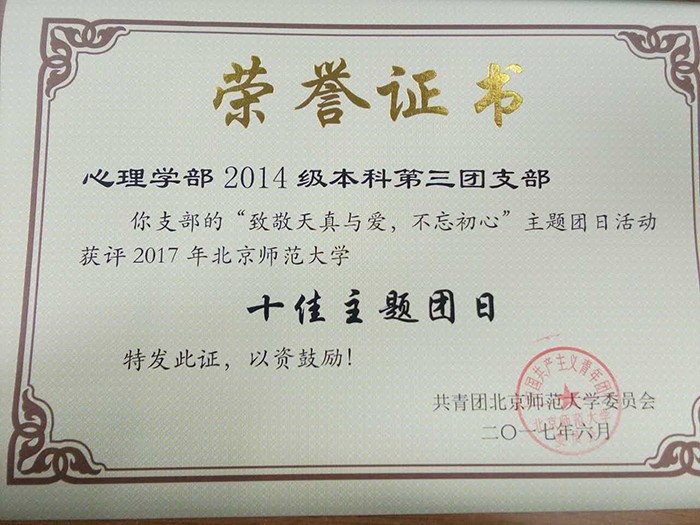 2017年6月6日,校团委公布了“不忘初心跟党走”优秀主题团日评选结果。我部14级本科第三团支部:“致敬天真与爱,不忘初心”主题团日活动以理论实践结合的活动形式、团员积极的参与意识、基层团支部紧跟党的步伐砥砺前行的意识获评“2017年污污漫画 十佳主题团日”。