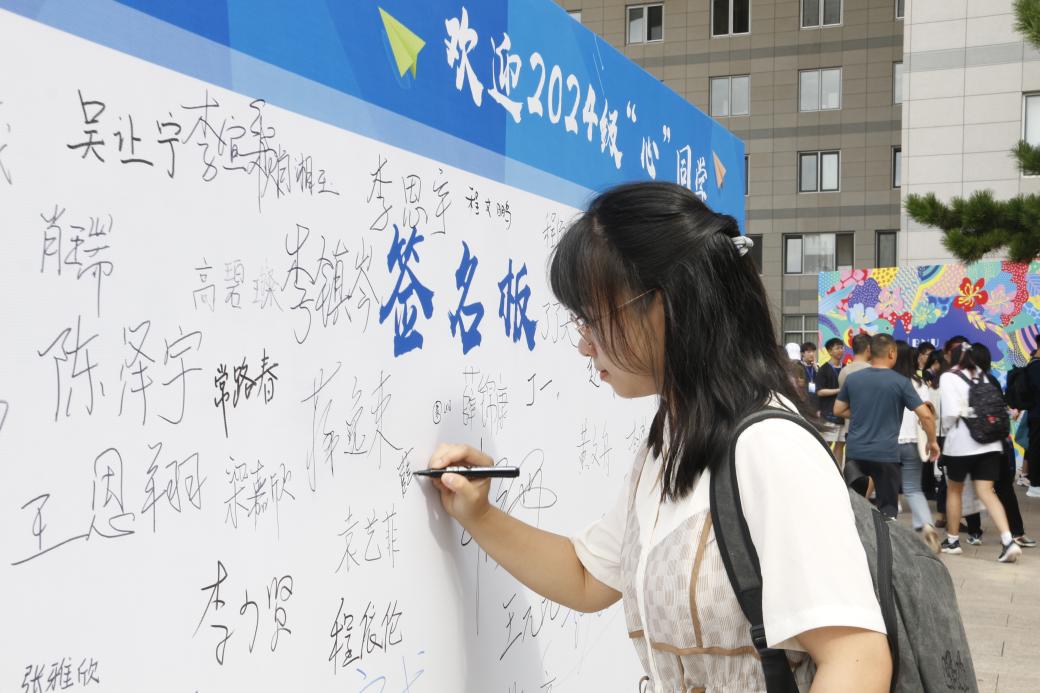 图7 新生在展板上签名并留影 迎新期间,校长于吉红,副校长汪明、陈兴等学校领导莅临学部迎新现场走访慰问,了解新生报到情况,与学部师生、工作人员、新生和志愿者们亲切交流、合影留念。