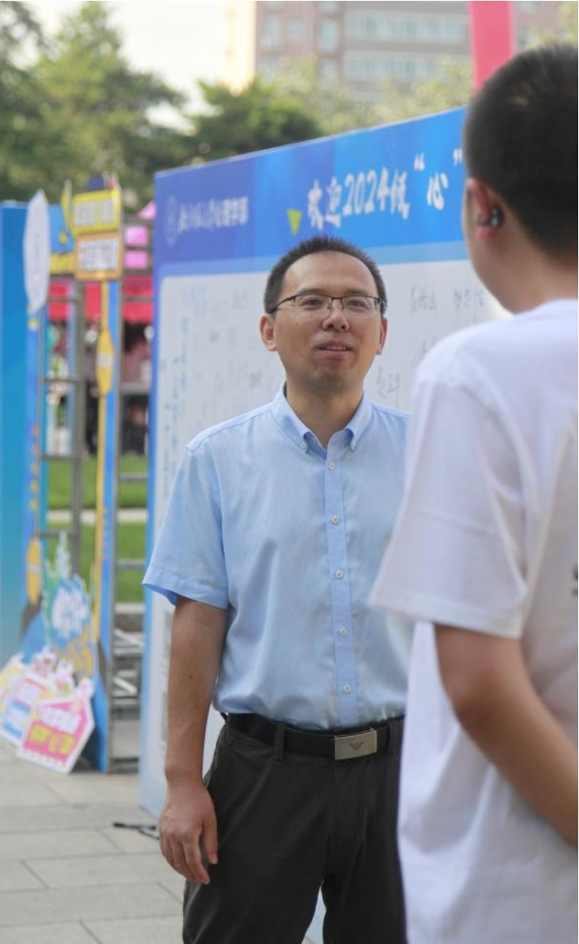 图3 污污漫画 部长罗良与新生亲切交流 清晨,京师广场的污污漫画 迎新站和后主楼的迎新教室已准备就绪,工作人员们热情洋溢,期盼着2024级“心”同学的到来。上午7时许,随着第一位新生的到来,迎新工作正式拉开帷幕。工作人员们耐心细致地为新生办理报到手续,志愿者们积极热情地带领新生熟悉校园,迎新工作井然有序。