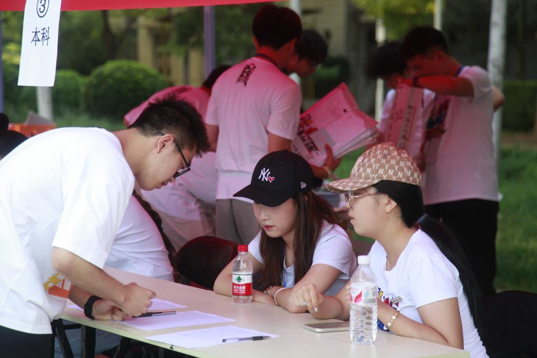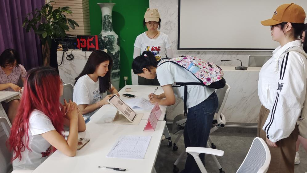 图5 工作人员为新生办理手续(后主楼1318) 新生在迎新站依次完成录取通知书盖章、电子注册、领取迎新物资后,由工作人员引导在新生签名板上签名并拍照合影,接受简短采访,留下踏入校园的第一次青春纪念。随后,新生在老生志愿者的一对一引领下,前往后主楼迎新教室办理户档等手续。专硕同学则在后主楼1420完成所有报到,并领取定制迎新礼包。开学第一天,新生们都收获了学校、学部以及师兄师姐们满满的关心和关爱。
