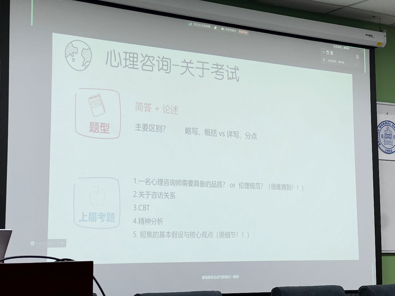 2024年12月20日晚19时至20时,学业辅导室在后主楼1420举办了面向2022级综合2班同学的期末经验分享会。 21级本科综合班的唐凤华同学作为线下嘉宾,21级本科综合班的刘慕义同学、21级本科师范班的黄彤彤同学作为线上嘉宾,和同学们分享了社会心理学、变态心理学、社会调查方法、心理咨询、管理心理学的复习方法,提示了应对期末考试的有效策略,为同学们的复习提供了具有针对性的抓手与方法。