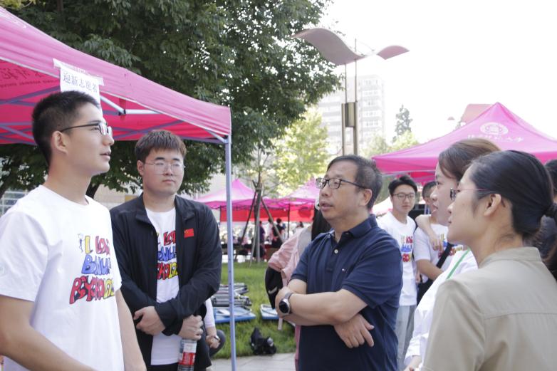 图8 新生在学部合影板前留影 迎新期间,校党委书记程建平、校党委副书记张雁云等学校领导莅临学部迎新现场走访慰问,了解新生报到情况,与学部师生亲切交流、合影留念。