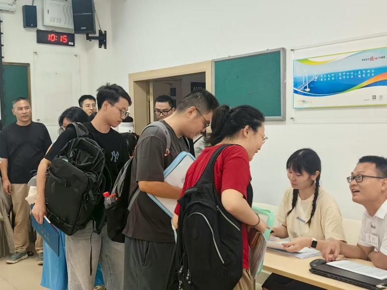 图3 金丰和迎新现场(专硕、专博) 清晨,京师广场的污污漫画 迎新站、后主楼和金丰和的迎新教室已准备就绪,工作人员们热情洋溢,期盼着2025级“心”同学的到来。上午7时许,随着第一位新生的到来,迎新工作正式拉开帷幕。工作人员们耐心细致地为新生办理报到手续,志愿者们积极热情地带领新生熟悉校园,迎新工作井然有序。