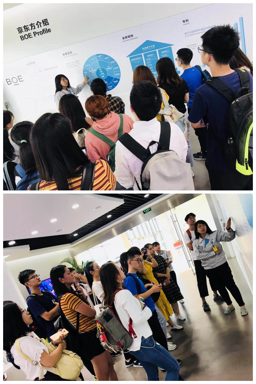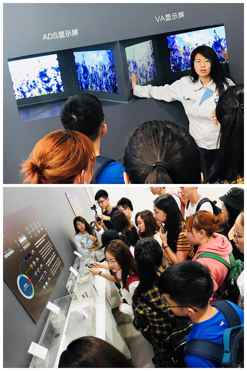 同学们首先来到企业的展示大厅,在展示人员的引领和介绍下,了解了京东方技术公司的公司概况和特色产品,以及京东方特有的液晶面板技术——ADSDS技术