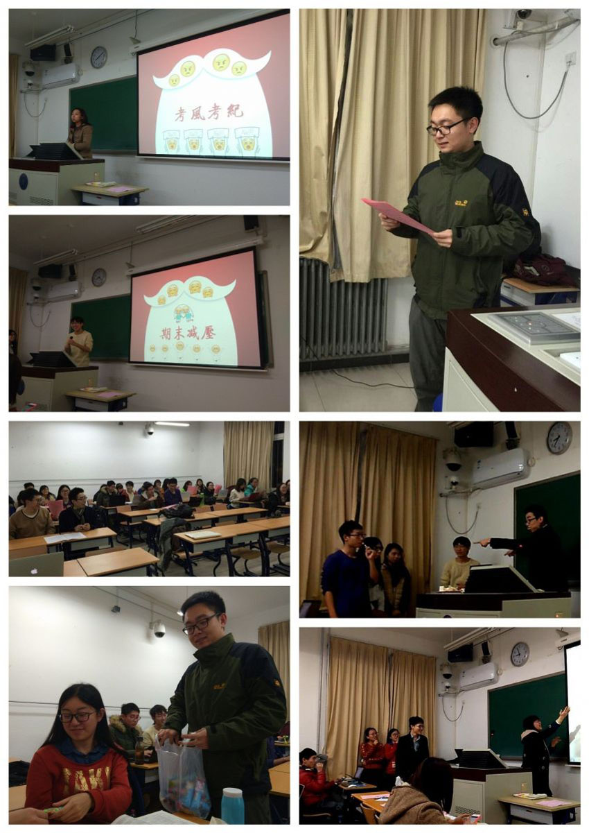 12月23日晚8点,心理学院13级本科3班于教四109成功举办考风考纪暨期末减压大会。 首先,由团支书张岂铭带领大家宣读了“文明考风,诚信考试”的承诺书。随后,班主任李爽老师进一步向大家强调了考风考纪,并表达了对同学们各方面的期待。 接下来,雪绒花使者林涛和伊乐为大家带来了减压活动,整个过程中同学们“脑洞打开”,笑声不断。 最后是圣诞节微信抢红包环节,抢到的红包份额最大的前三名同学获得了上台进行真心话大冒险的“奖励”,再一次给同学们带来了欢乐。在表演结束后,班长李卉子对本次班会进行了总结,并表达了圣诞节的祝福,活动在大家的一片掌声中结束。 本次考风考纪大会让同学们更清楚地认识到诚信考试的重要性,杜绝作弊等行为。也给大家提供了一个自由表演的机会,通过开怀大笑的方式缓解了期末各方面的压力,为战胜作业和考试做了心理上的调适。 (心理学院2013级本科3班 郭名扬供稿供图) |