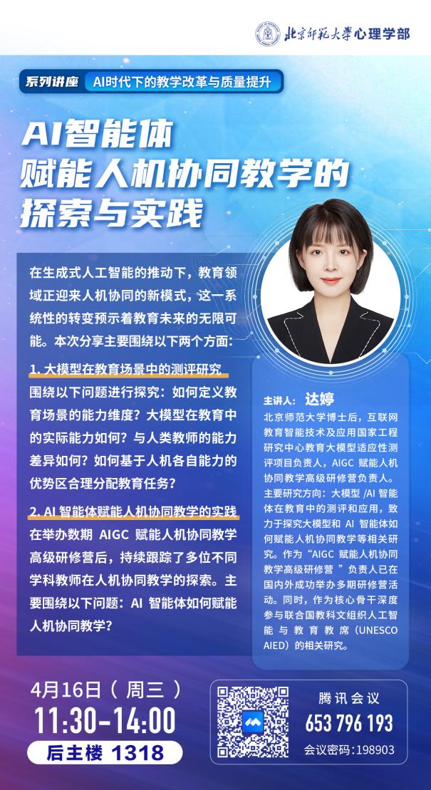 | 【讲座】AI智能体赋能人机协同教学的探索与实践——AI时代下的教学改革与质量提升系列讲座 |
