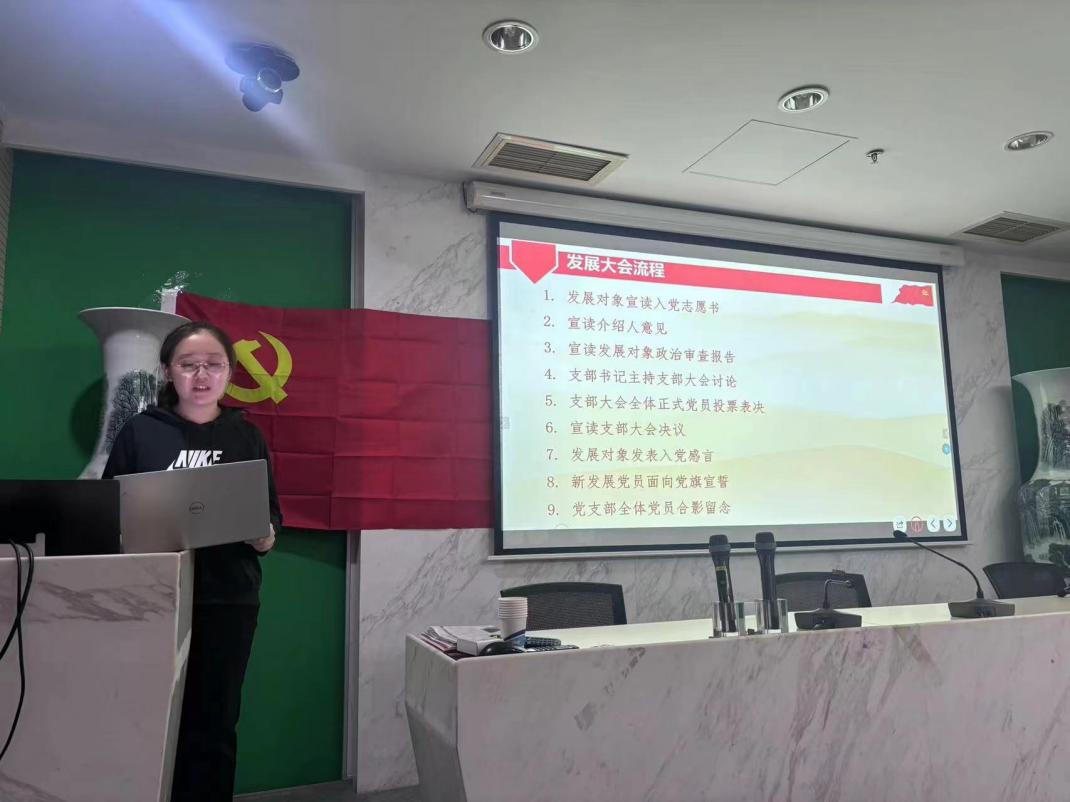 首先,雷亦婷同志宣读了自己的入党志愿书,并向党组织汇报了她成为积极分子以来的思想、学习、工作等情况。两位入党介绍人汇报了雷亦婷同志的有关情况以及对其入党的意见。组织委员宣读了对雷亦婷同志的政治审查综合报告。随后,在支部书记的组织下,与会党员针对雷亦婷同志的平时表现进行了热烈的讨论和评议,讨论中指出了该同志的优、缺点,认为雷亦婷同志入党动机端正,自提出入党申请以来,一直积极向党组织靠拢,认真学习理论知识,经常向党组织汇报思想学习情况,热心助人,并时刻以党员先锋模范的标准要求自己。讨论过后,与会正式党员对雷亦婷同志能否按期发展采用无记名投票的方式进行表决。经过计票,支部书记宣布大会决议,支部大会通过接收雷亦婷同志为中共预备党员。雷亦婷同志发表入党感言,表示将来会继续严格要求自己,努力学习,争取发挥党员的先锋模范作用。 然后,刘一诺同志宣读了自己的入党志愿书,并介绍了自成为积极分子以来在工作、学习和生活中的表现情况。随后,两位入党介绍人汇报了刘一诺同志的有关情况以及对其入党的意见。组织委员宣读了对刘一诺同志的政治审查综合报告。之后,在支部书记的组织下,与会党员针对刘一诺同志的平时表现进行了热烈的讨论和评议,讨论指出了该同志自提出入党申请以来,积极向党组织靠拢,在支部的各项活动中能够积极发言,表达自己的观点,认为刘一诺同志已经基本符合一名中共党员的条件。讨论过后,与会正式党员对刘一诺同志能否按期发展采用无记名投票的方式进行表决。经过计票,支部书记宣布大会决议,支部大会通过接收刘一诺同志为中共预备党员。刘一诺同志发表入党感言,表示会继续坚定理想信念,用严格的标准要求自己,紧跟党走,不负使命。 接着,杨媛同志宣读了自己的入党志愿书。两位入党介绍人汇报了杨媛同志的有关情况和对其入党的意见。组织委员宣读了对杨媛同志的政治审查综合报告。随后,支部书记陈璐组织参会党员对杨媛同志能否发展为预备党员进行热烈讨论。同志们认为该同志积极参与学习工作、志愿服务以及科研项目,服务意识强烈。讨论过后,大会全体正式党员采用无记名投票的方式对发展结果进行表决。经过计票,支部书记宣布大会决议,同意接收杨媛同志为中共预备党员。随后,杨媛同志发表了入党感言,表示会继续在思想和实践上不断提高,努力成为一个优秀的共产党员。
