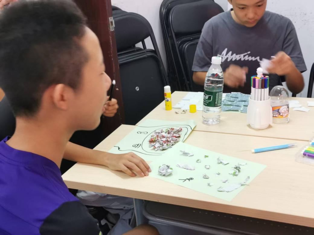 活动伊始,进入到“情绪拼图”环节。王韵琀同学以亲切的问候开场:“欢迎各位小朋友来到今天的‘情绪魔法屋’,接下来我们会一起用画笔和纸张玩几个有趣的游戏,大家准备好变身小艺术家了吗?”随后介绍了活动的“三个自由”规则——自由表达、自由参与、自由创造,还展示了水彩笔、白纸等道具,瞬间点燃了孩子们的参与热情。 在“情绪涂涂乐”环节,孩子们拿起自己喜欢的笔,将心里的各种感觉尽情画在纸上。不管是开心的喜悦,还是生气的愤懑,都通过色彩和线条展现出来。接着是“情绪撕撕乐”,孩子们把画满情绪的纸撕成小碎片。他们有的用力撕,有的慢慢撕,在撕纸的过程中,仿佛将情绪也一同释放。到了“情绪贴贴乐”,孩子们用固体胶将这些碎片贴在另一张白纸上,拼出全新的画作。原本代表各种情绪的碎片,在他们的巧手下,变成了花朵、小船、星空等各种各样充满创意的作品。